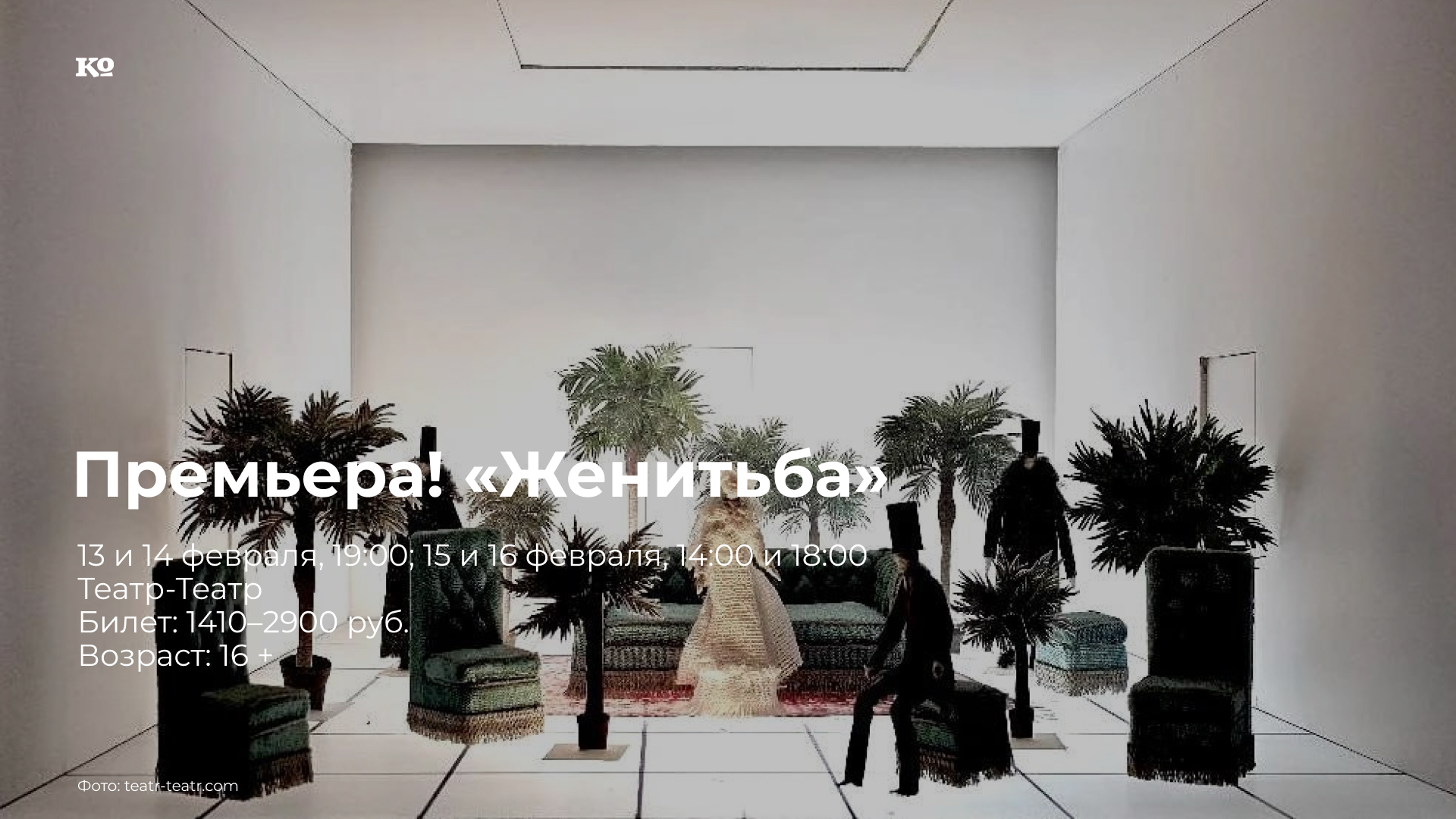Февральская премьера на большой сцене ТТ — настоящий подарок для всех, кто соскучился по драме, спектакль по написанной без малого 200 лет назад пьесе Николая Васильевича Гоголя. Дворянин Иван Кузьмич Подколёсин, решив жениться, обращается к свахе Фёкле Ивановне. Эту же сваху Агафья Тихоновна Купердягина, 26-летняя купеческая дочь, просит найти достойного жениха. Казалось бы, складывается идеальная пара. Но счастливой женитьбы не происходит… Зрители увидят драматический спектакль, в котором полностью сохранён текст Гоголя, действие не перенесено в современность, а психологический портрет каждого персонажа тонко, с предельным интересом и нежностью прорисован ведущими артистами труппы.