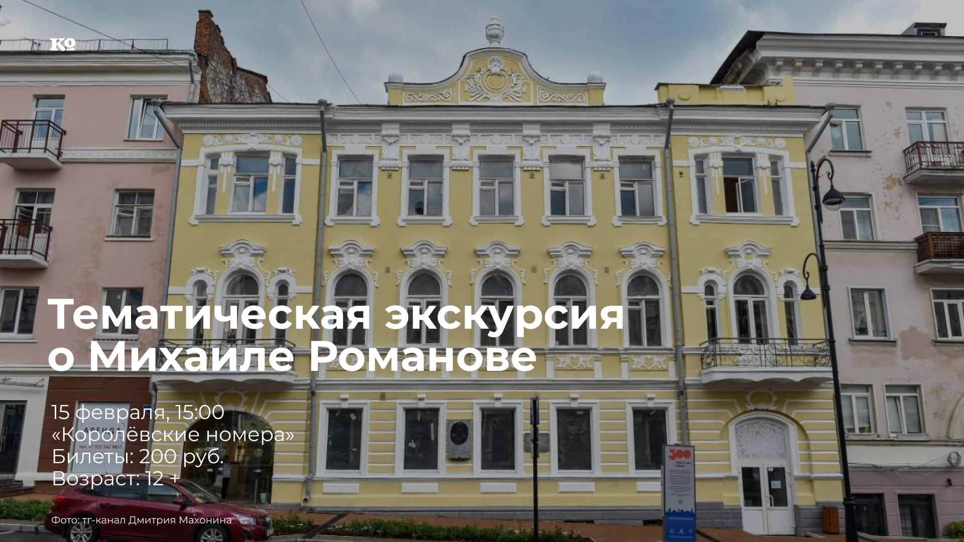 На тематической экскурсии «Великий князь Михаил Александрович: жизнь и служение Отечеству» рассказ пойдёт о жизненном пути Михаила Александровича Романова, его семейном окружении, о его взаимоотношениях с отцом — императором Александром III — и братом — императором Николаем II; о его взрослении и образовании, службе офицером, участии в Первой мировой войне и командовании знаменитой Дикой дивизией. Будет уделено внимание деятельности на посту члена Государственного Совета и Комитета министров, участию в создании Государственной Думы, а также общественному служению. В заключение речь пойдёт о пермском периоде Михаила Романова. Экскурсию ведёт Дмитрий Софьин, кандидат исторических наук, ведущий научный сотрудник Исторического парка «Россия — Моя история».