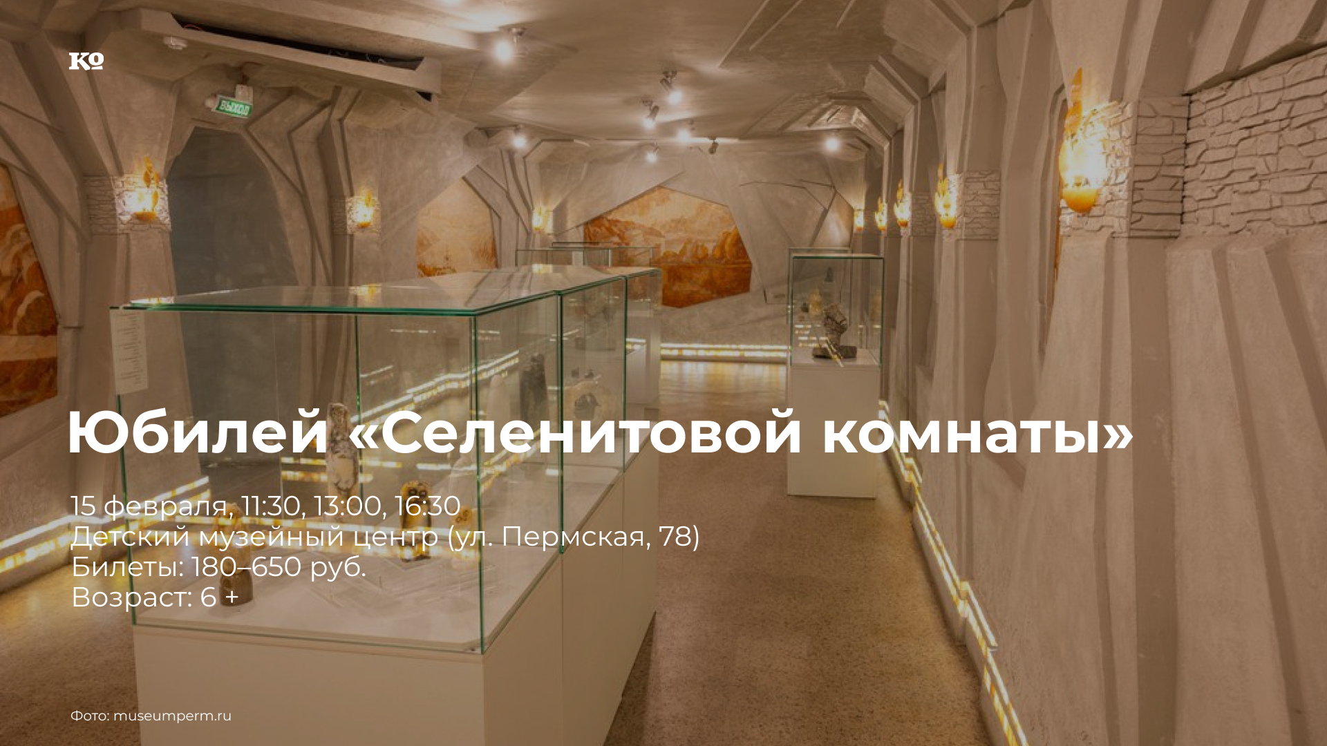 «Селенитовая комната» открылась для посетителей 15 февраля 2015 года. Аналогов ей нет не только в России, но и в мире. Скопления полупрозрачного минерала образовались в кунгурский век раннепермской эпохи и сейчас являются уникальными минеральными реликтами пермского геологического периода. О селените говорят, что он сохранил свет пермского периода. Пермский краеведческий музей приглашает на сборные экскурсии по «Селенитовой комнате», приуроченные к 10-летию экспозиции. Участники экскурсии узнают о происхождении и свойствах селенита, познакомятся с историей камнерезного промысла в Прикамье, увидят произведения камнерезного искусства из коллекции Пермского краеведческого музея.