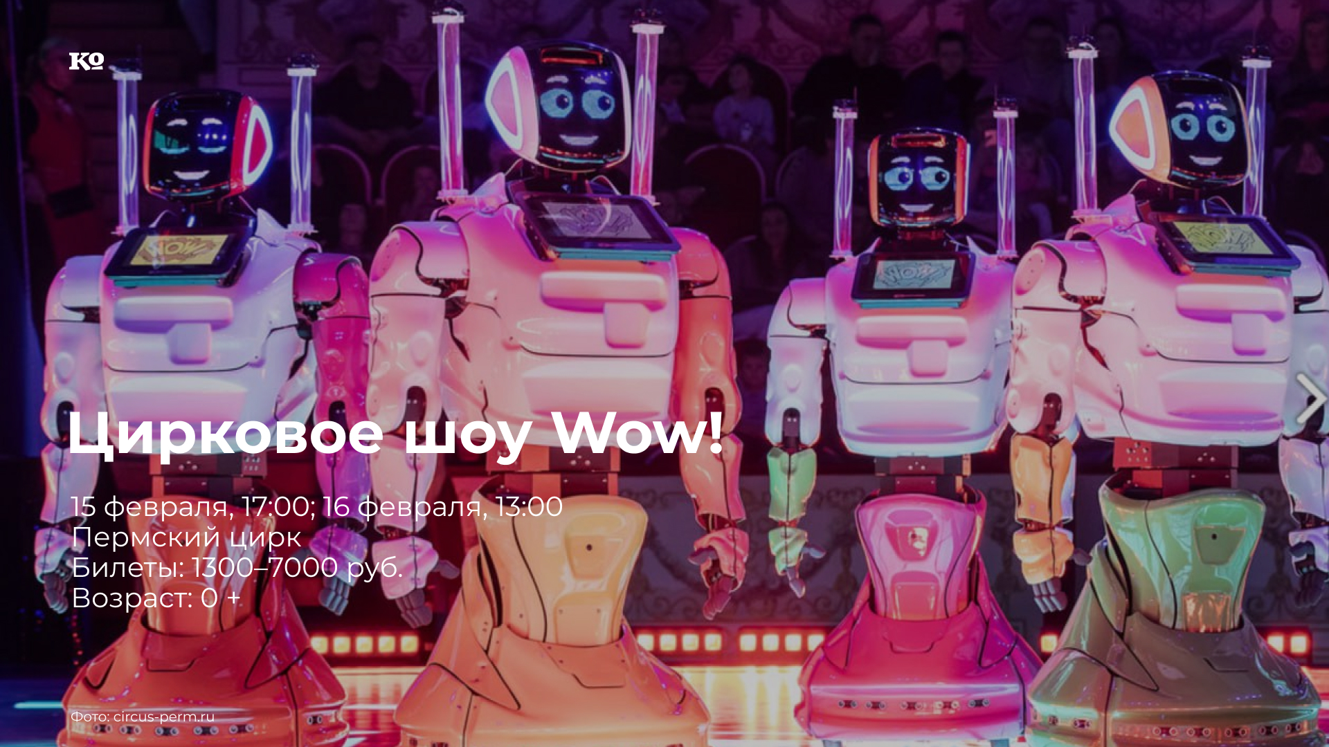 Впервые в Перми — роботы на арене. WOW — зрелище нового поколения, в котором цирковое искусство сочетается с новейшими технологиями. Специально для программы компания Promobot создала роботов Promobot V.4, которые вместе с артистами являются полноценными участниками действия. Они умеют танцевать, а также охотно общаются со зрителями. Помимо роботов, гости увидят трюки воздушной гимнастки Екатерины Шустовой, аттракцион с белыми тиграми под руководством Алисы Нестеревой, забавных обезьянок под руководством Серея Стрелецкого и Ольги Ван-Ю-Ли и клоунов братьев Аверюшкиных.