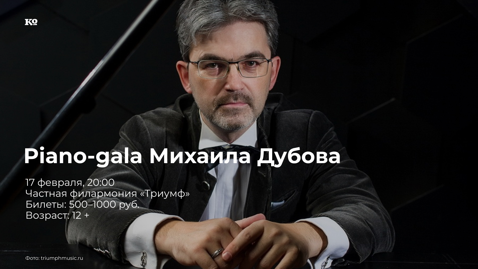 Концертный проект Piano Gala — это цикл сольных фортепианных концертов практически в полной темноте, только один-единственный луч софита — на рояль и на парящие над клавишами руки пианиста. По традиции зрители могут располагаться на пуфиках и подушках почти у самого рояля, а также на обычных зрительских местах. Михаил Дубов — профессор Московской консерватории, декан факультета исторического и современного исполнительского искусства, кандидат искусствоведения. Солист Московского ансамбля современной музыки (МАСМ). Творческие интересы музыканта включают в себя широкий диапазон музыкальных стилей и направлений, его репертуар постоянно пополняется, в том числе редко исполняемой музыкой прошлого и сочинениями композиторов сегодняшнего дня. В программе — произведения Шуберта, Чайковского, Равеля, Стравинского и Кейджа.
