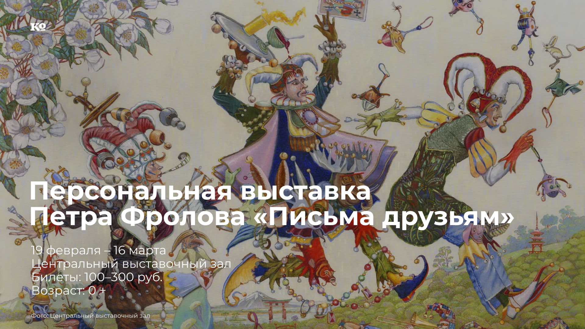 Пётр Фролов — детальный художник. Его работы погружают зрителя в фантазийный мир, сказочное путешествие, из которого не хочется возвращаться. «Письма друзьям» — это зашифрованное послание, текст в изображениях, который надо разгадать и расшифровать. Автор не расшифровывает нарисованное — каждый в холсте видит то, что ему видится. Получается личное прочтение письма-образа. Отдельное выставочное пространство посвящено знаменитой фроловской «Азбуке». Азбука-загадка, азбука-квест, путь длиной в 59 букв — 33 русских и 26 английских, который так интересно пройти. 14 лет художник работал над этим проектом, в 2017 была издана «Русская Азбука», в 2024 — «Английская Азбука».