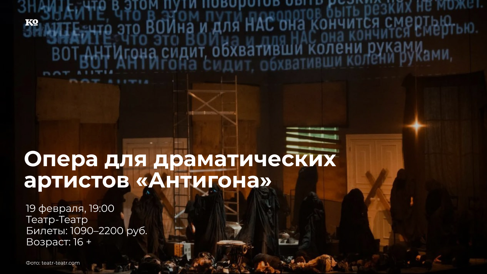 Грязь, разруха, разлагающиеся трупы, смрад, отравленный воздух... В Фивах только что закончилась гражданская война. Развязавшие ее братья Этеокл и Полиник, сыновья Эдипа, мертвы. К власти приходит Креонт. Стремясь предотвратить новые волнения и навести порядок в стране, он приказывает с почестями похоронить Этеокла, а Полиника, нарушившего договор о смене власти, оставить на растерзание птицам и псам. Юная Антигона решает предать тело брата земле. За нарушение запрета царя ей грозит смертная казнь... Опера Ольги Шайдуллиной была написана специально для Театра-Театра. В 2022 году спектакль получил три Национальные театральные премии «Золотая маска». В ролях: Альберт Макаров, Эва Мильграм, Анна Огорельцева, Анна Сырчикова.