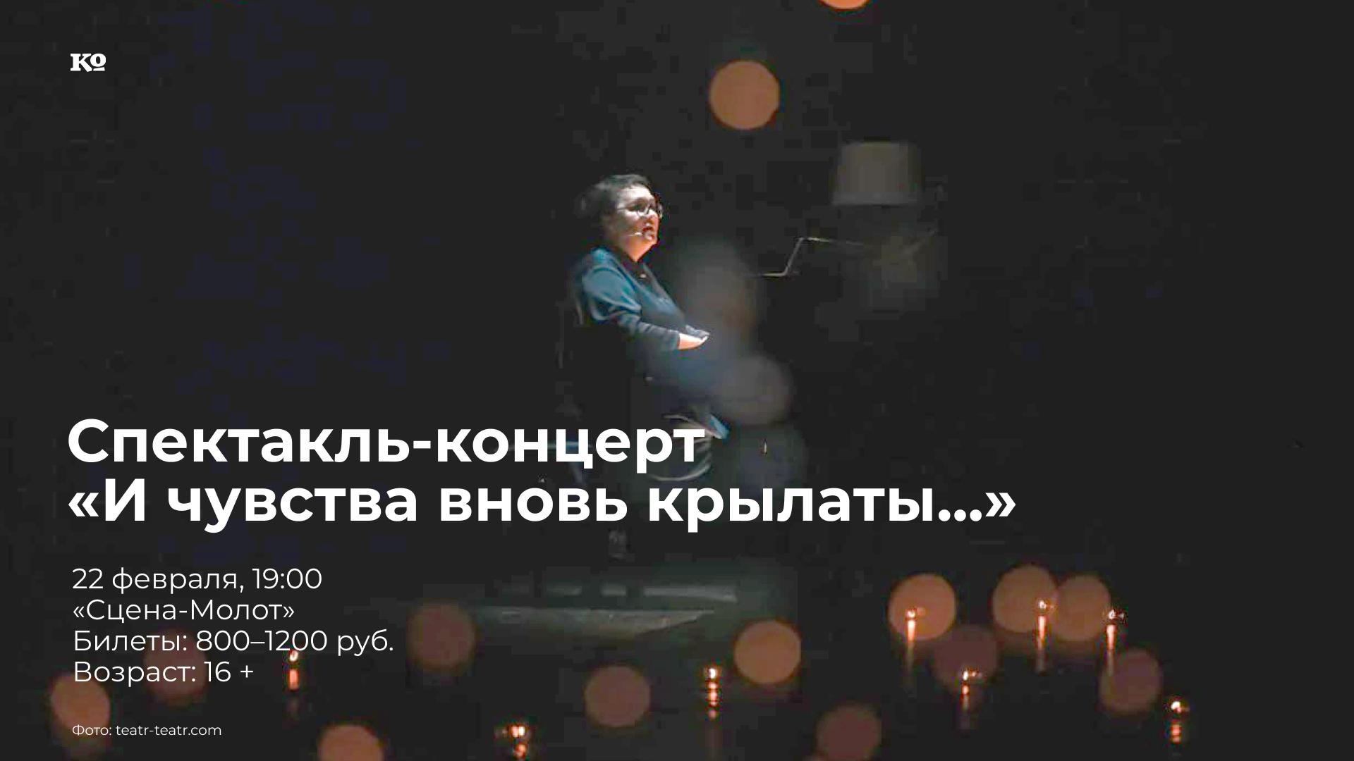 Романсы на стихи русских поэтов в исполнении композитора, музыкального руководителя и дирижёра Театра-Театра, неоднократного номинанта и лауреата «Золотой Маски», заслуженного работника культуры РФ Татьяны Виноградовой. За время работы в театре Татьяна Виноградова написала музыку для десятка спектаклей и принимала участие в создании музыкального оформления многих постановок. Спектакль-концерт «И чувства вновь крылаты...» — ее сольный авторский проект. Татьяна Вячеславовна предстанет перед зрителями как композитор цикла романсов на стихи поэтов Серебряного века (и не только), как тонкий, харизматичный исполнитель собственных произведений.
