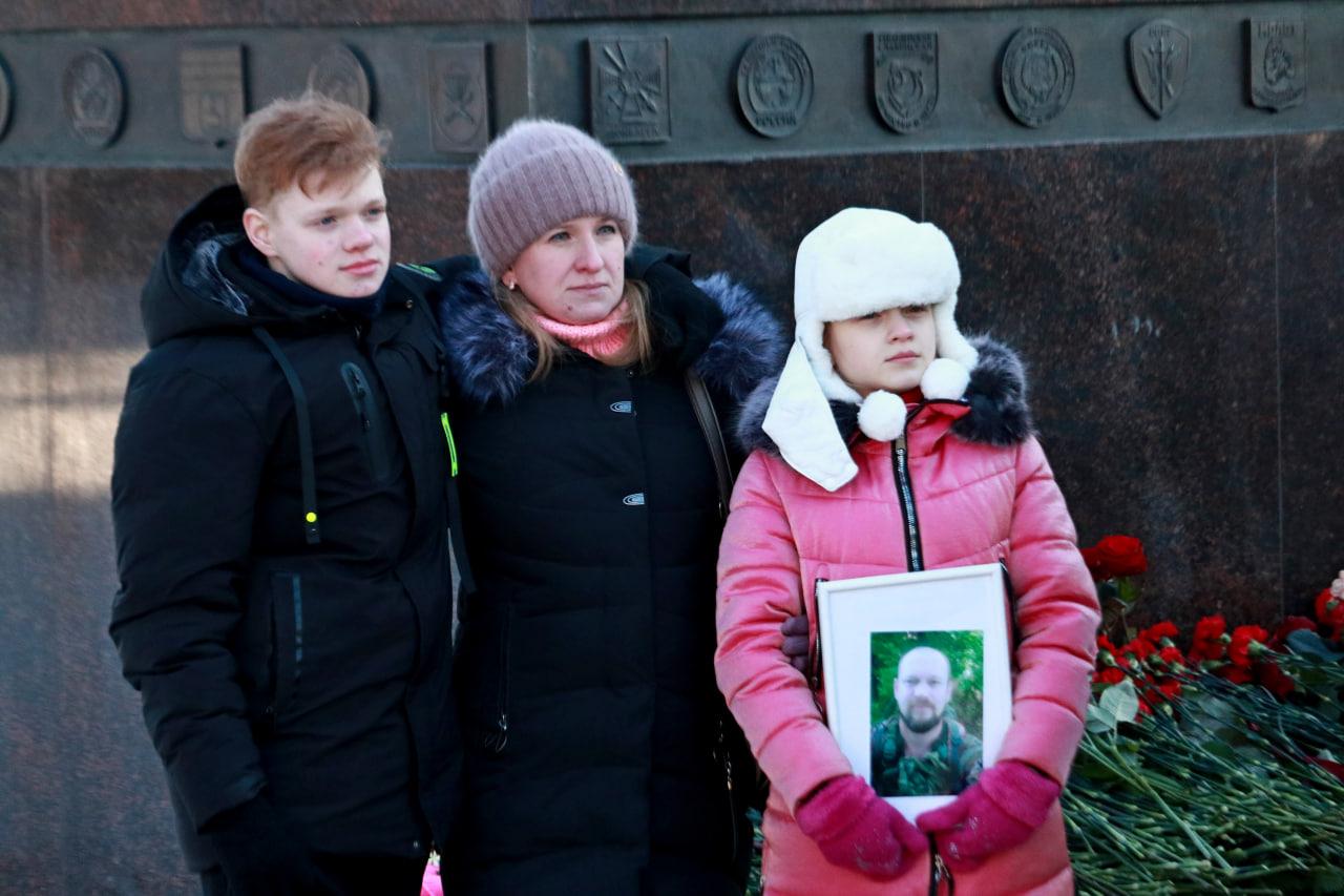 Семьи погибших участников СВО фотографировались на фоне монумента.