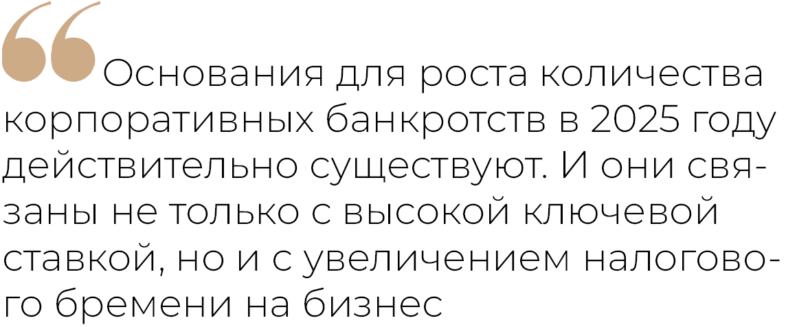 По мнению Татьяны Миролюбовой, основания для роста количества корпоративных банкротств в 2025 году действительно существуют. И они связаны не только с высокой ключевой ставкой, но и с увеличением налогового бремени на бизнес. Речь идёт о росте ставки по налогу на прибыль, введении ставки налога на прибыль для ИТ-сферы в 5%, введении НДС для малого бизнеса на УСН и пр. Усиливать неустойчивость бизнеса будет и дальнейший рост инфляции.