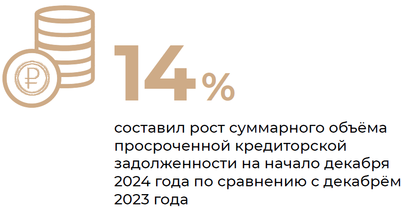 По данным Пермьстата, по состоянию на начало декабря 2024 года суммарный объём просроченной кредиторской задолженности увеличился по сравнению с той же датой предыдущего года на 14%. При этом сумма просроченной кредиторской задолженности перед поставщиками достигла 34,3 млрд руб. при 24,4 млрд руб. на 1 декабря 2023 года (прирост 40%).