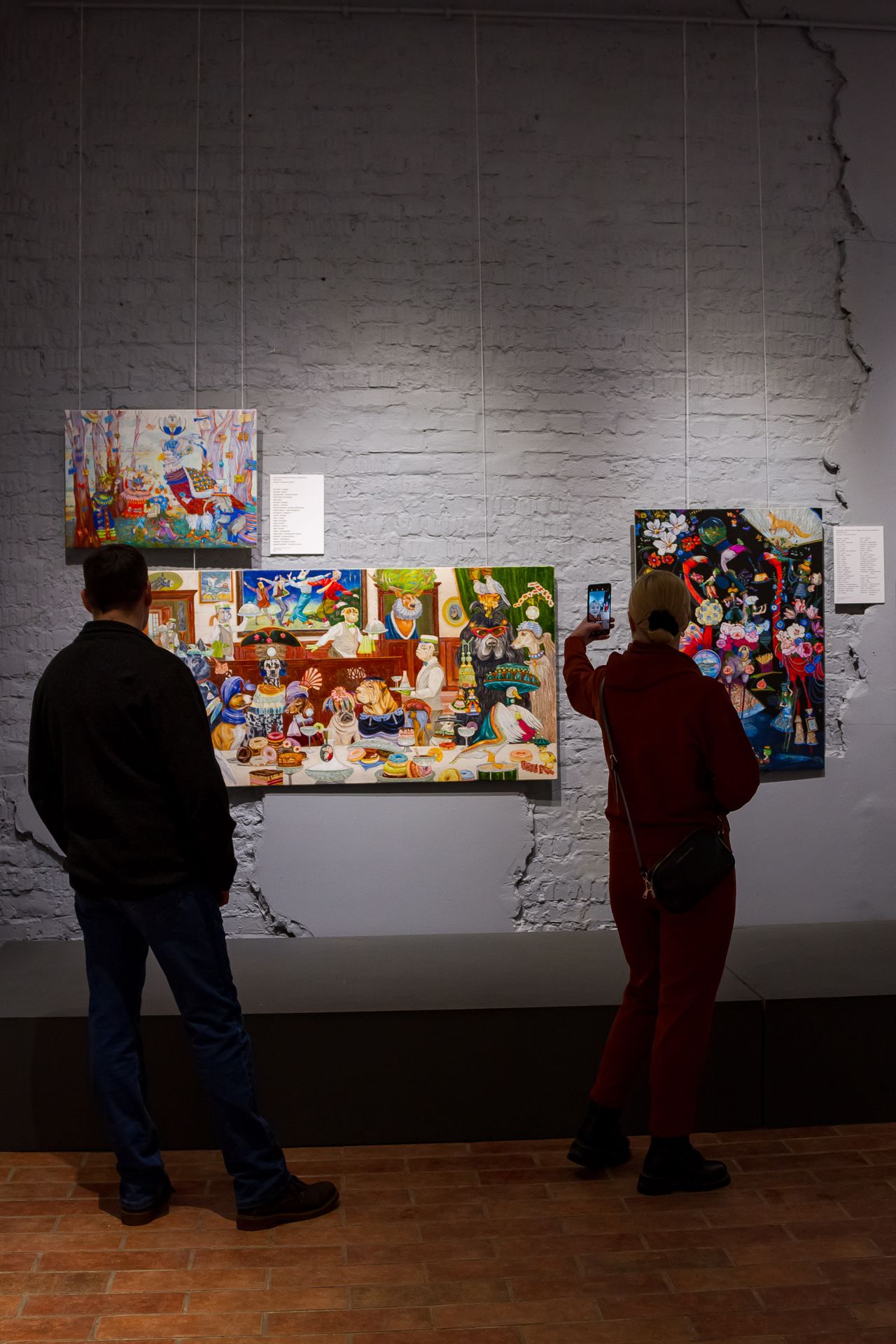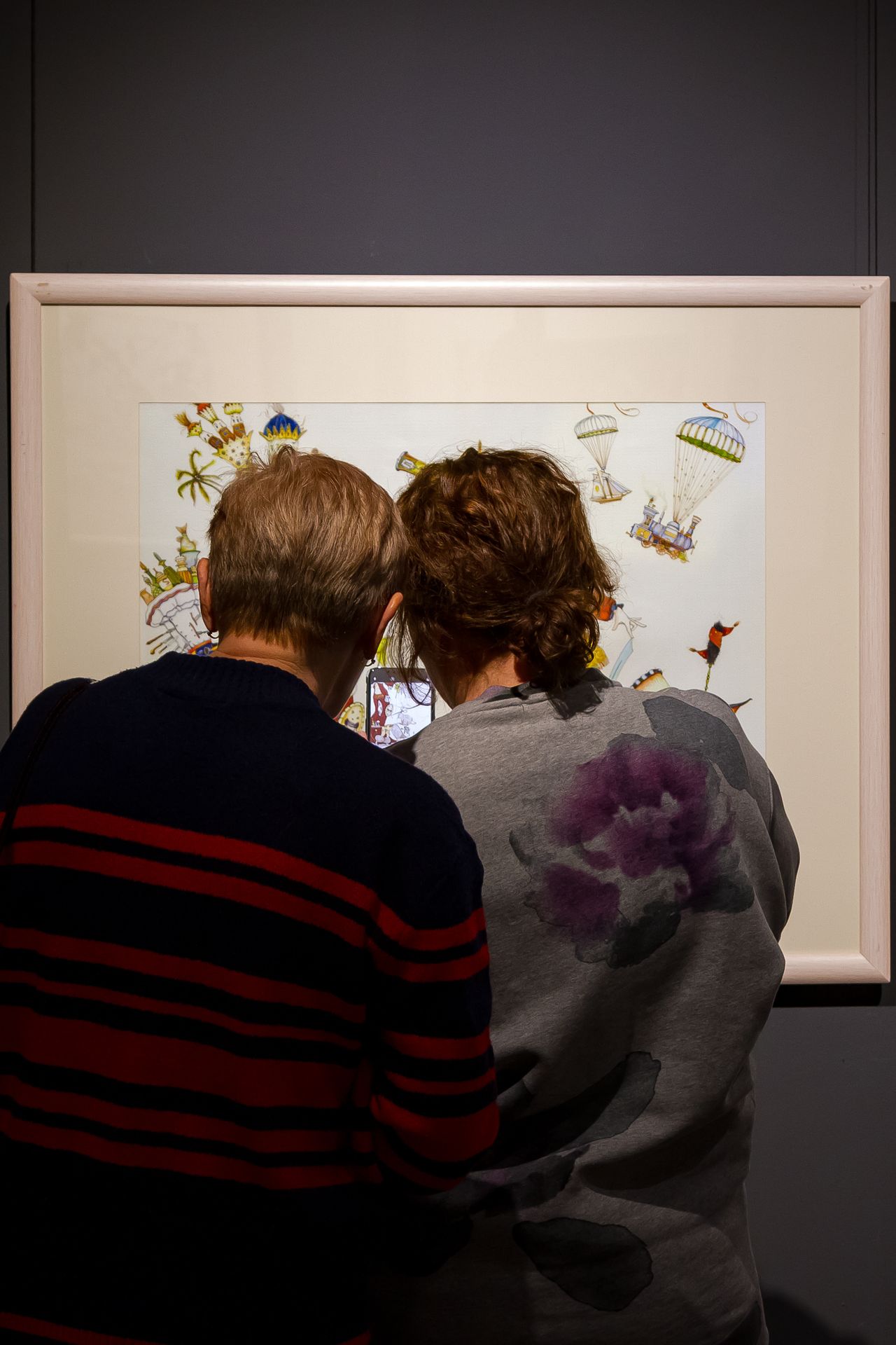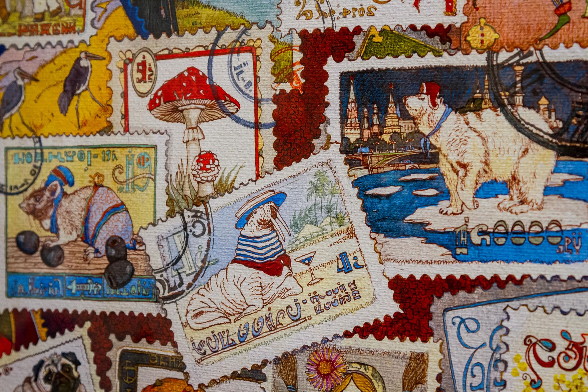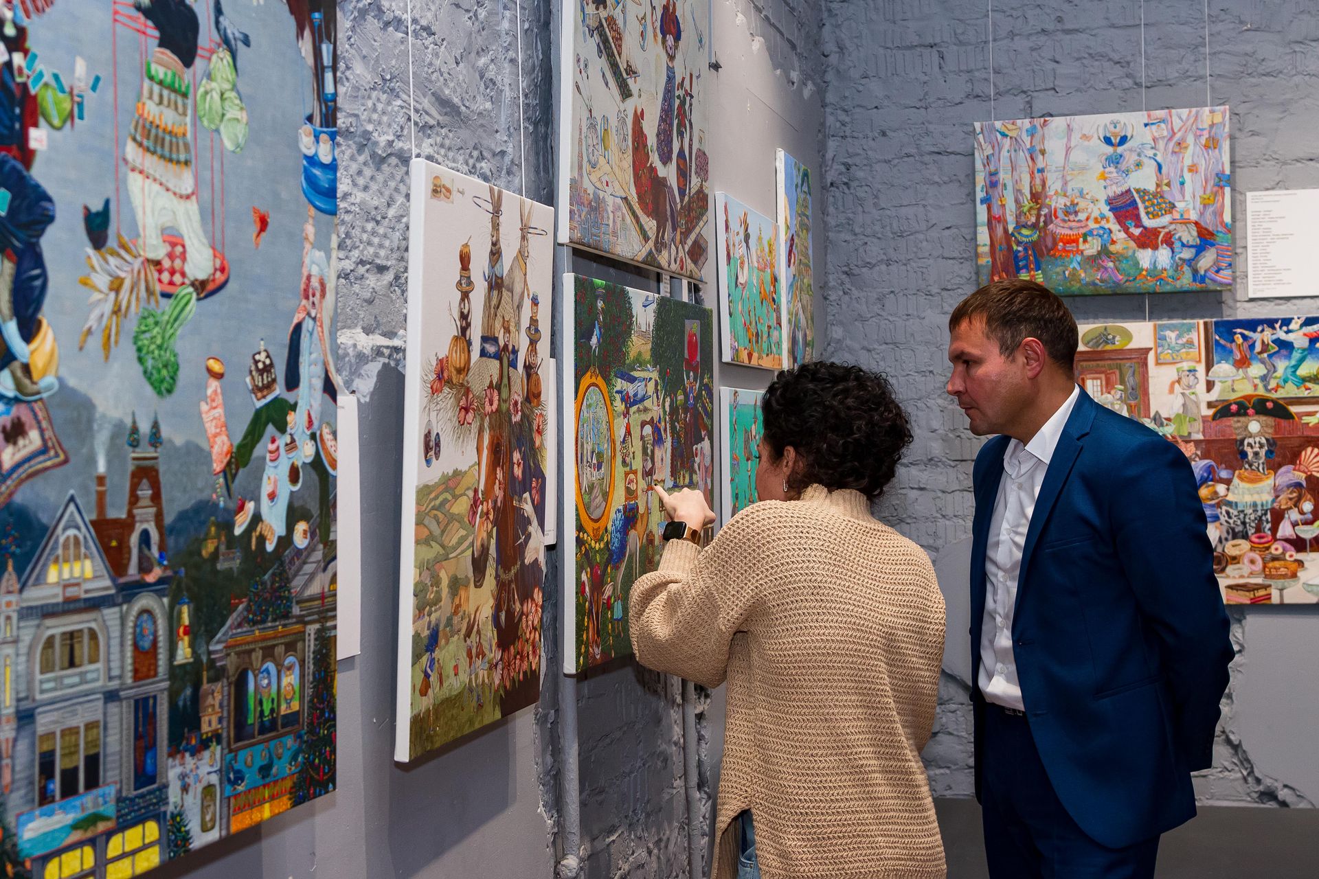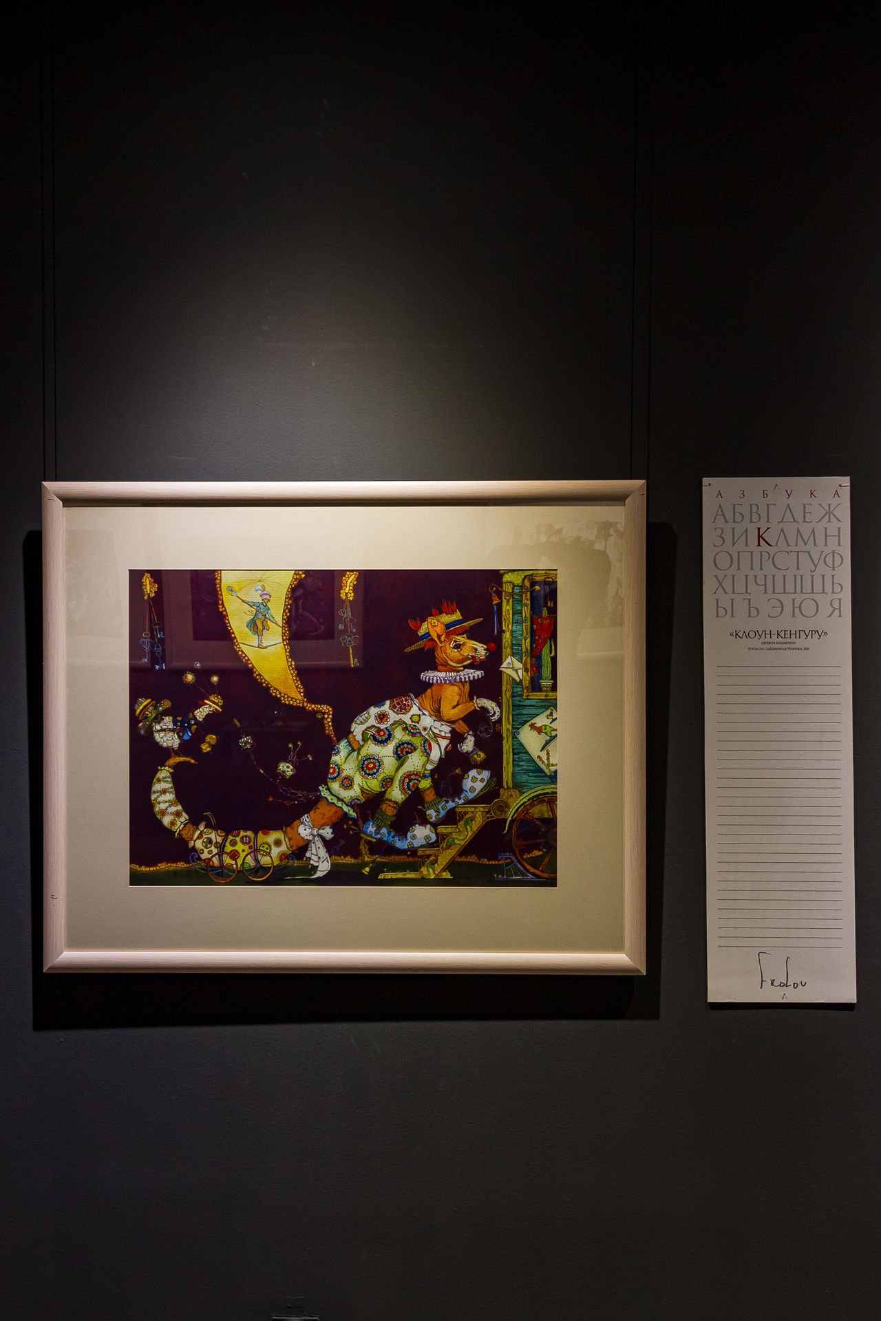 Это настоящий квест, который надо не наблюдать, а проходить. Особенно важен такой подход при общении с картинами из серий «Русская азбука» и «Английская азбука»: художник подарил зрителю особую игру — в каждую картину он поместил сотни предметов, понятий и персонажей на одну букву, и «собирать» их — отдельное развлечение. «Боксёр, бультерьер, бадминтон, баскетбол, бельё, башмаки…» Рядом с каждой из картин — табличка, в которую гости могут вписывать свои «находки»: кто больше? Можно разнообразить игру — например, «собирать» не все подряд предметы, а по категориям. Вот, скажем, животные на «С»: суслик, сурок, сурикат…