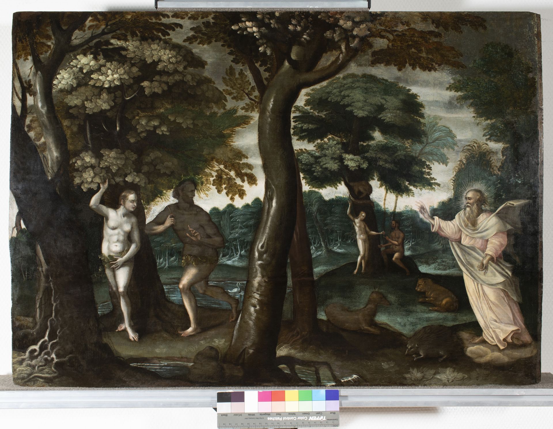 В преддверье переезда в новое здание картину отправили на реставрацию в центр им. Грабаря (Москва), и там, как положено, начали с рентгена, который показал, что под слоем краски в правой части полотна находится ещё один персонаж сюжета о грехопадении Адама и Евы — Бог-Отец. Это непременно надо видеть своими глазами: глядя на картину до реставрации, ни за что не угадать, что на ней что-то перерисовано. Больше 30 лет она провела в Пермской галерее, и никто не догадался, что сюжет картины был изменён.