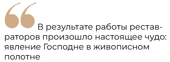 В результате работы реставраторов произошло настоящее чудо: явление Господне в живописном полотне. Реставраторы аккуратно сняли верхний слой краски, и полотно стало не просто лучше — оказалось, что это работа более высокого уровня: композиция приобрела законченность и драматизм, появился новый колорит, новые живописные штрихи.