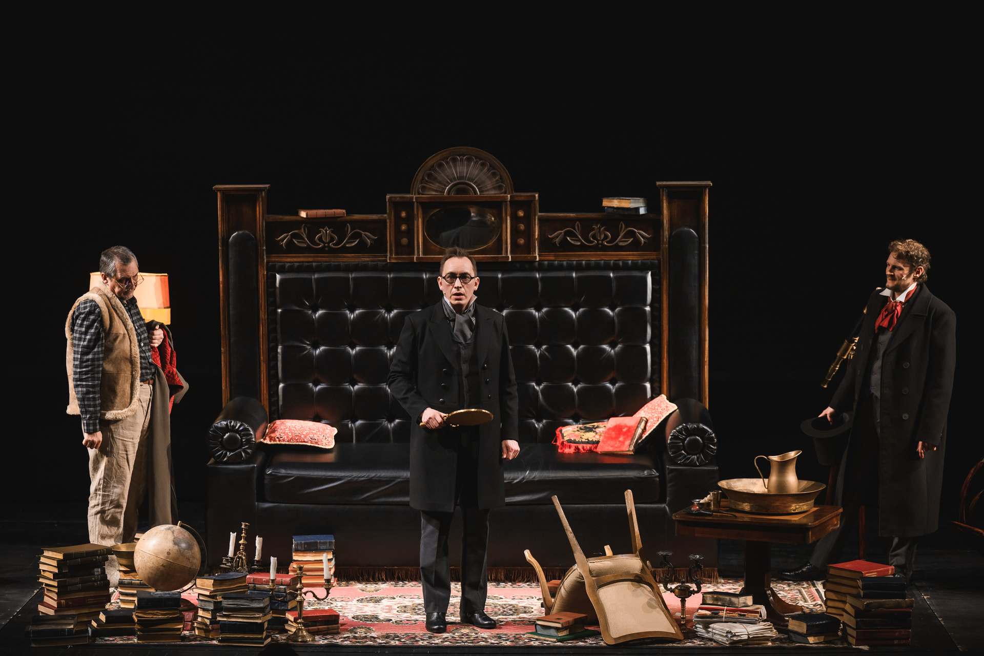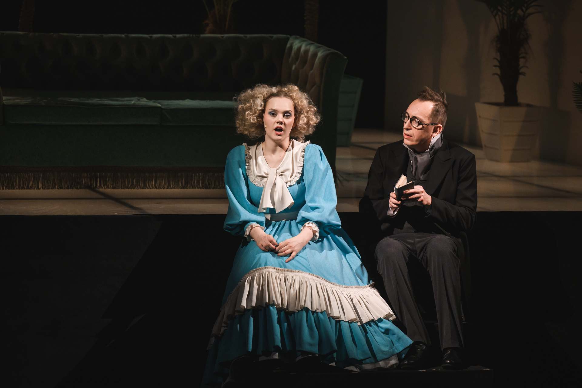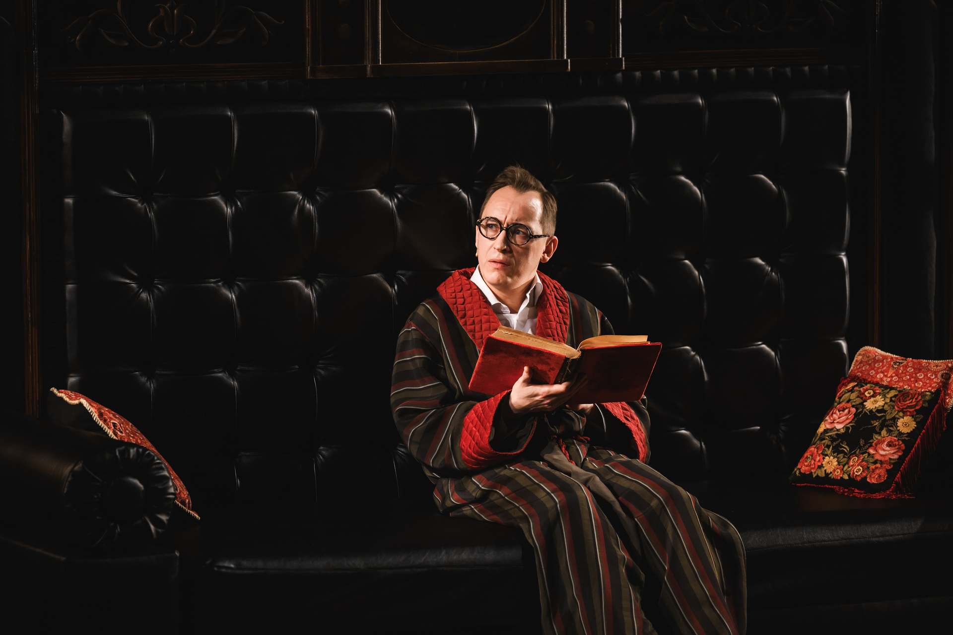 Кем только не был Подколёсин в интерпретациях гоголевской пьесы! Трусом, волокитой, просто дурачком. Обаятельный герой Альберта Макарова — застенчивый, самоуглублённый одиночка, которому очень уютно на диване в окружении любимых книг. Недаром художник Симон Пастух снабдил его трогательными очками, делающими Подколёсина похожим на Грибоедова: это книжный человек, который побаивается реального мира. Он вроде и понимает, что надо выйти из «зоны комфорта», надо, в конце-то концов, жениться, семью завести… Но зачем?