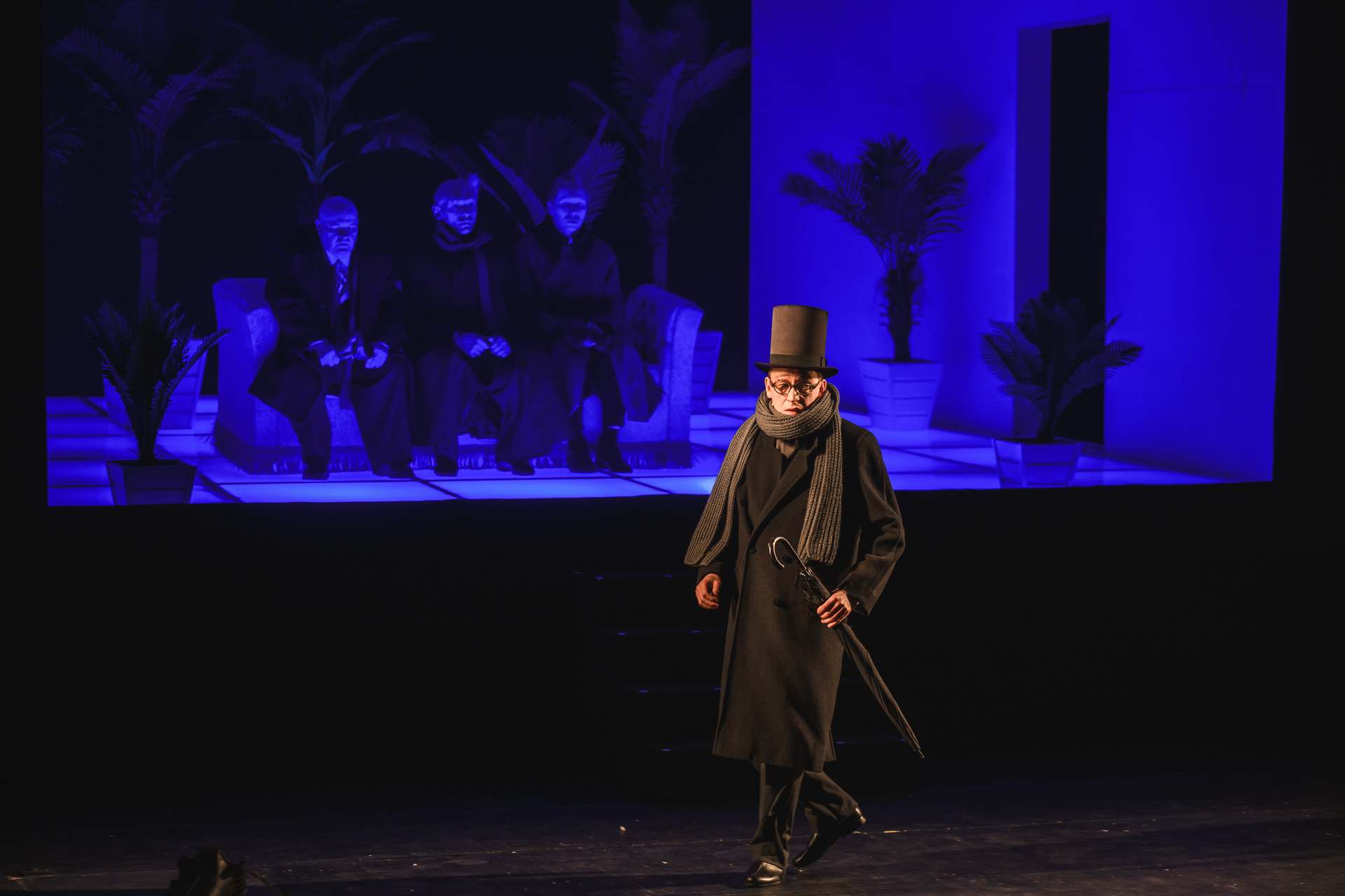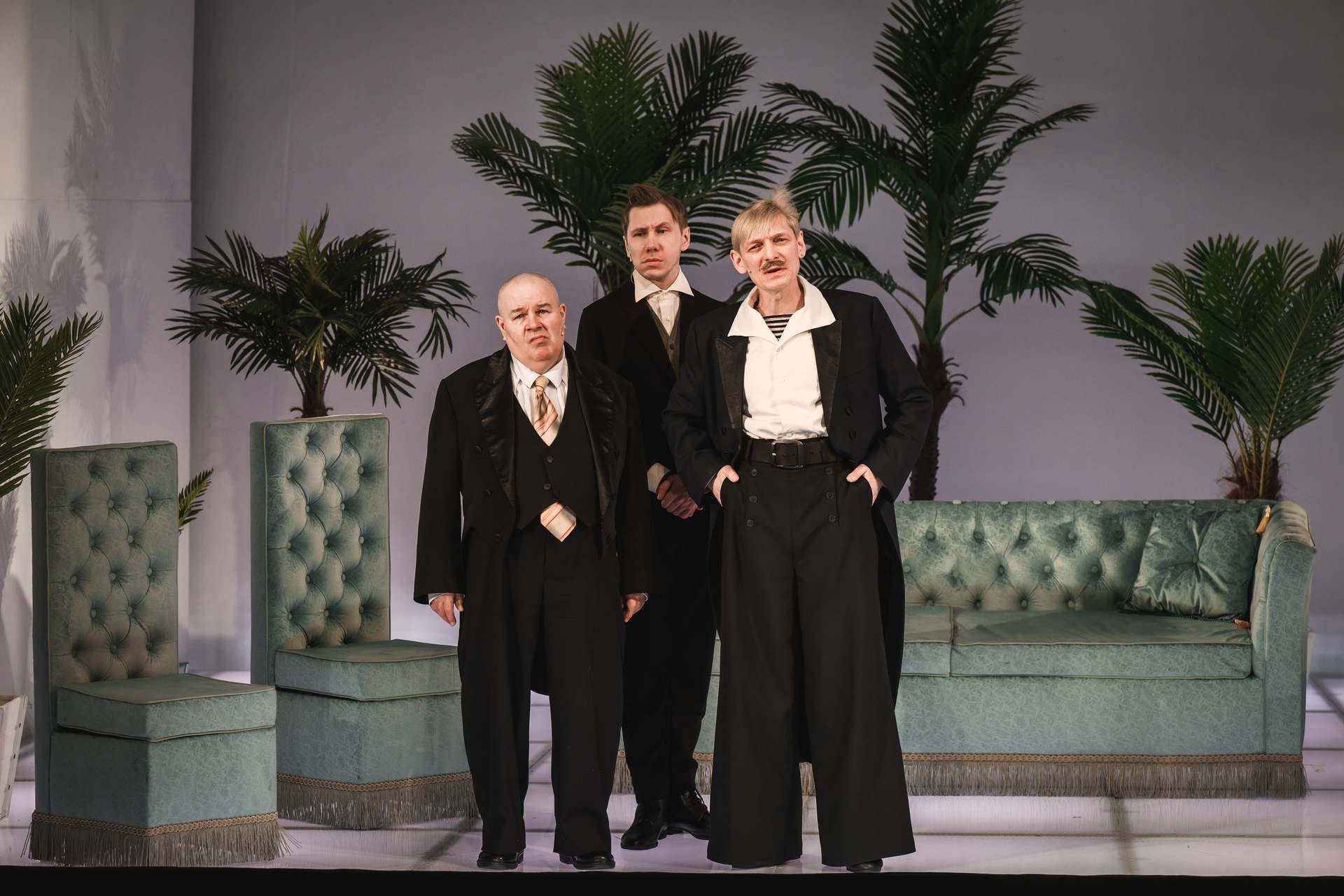 Финал первого действия, проход женихов по авансцене на фоне тёмного ливня под звуки рояля, — очень важная сцена в спектакле. Здесь без слов виден характер каждого из персонажей. Походка, манера держаться — всё это придумано неведомым режиссёром и исполнено артистами блестяще. Именно женихи — главный источник веселья в этой версии «Женитьбы».