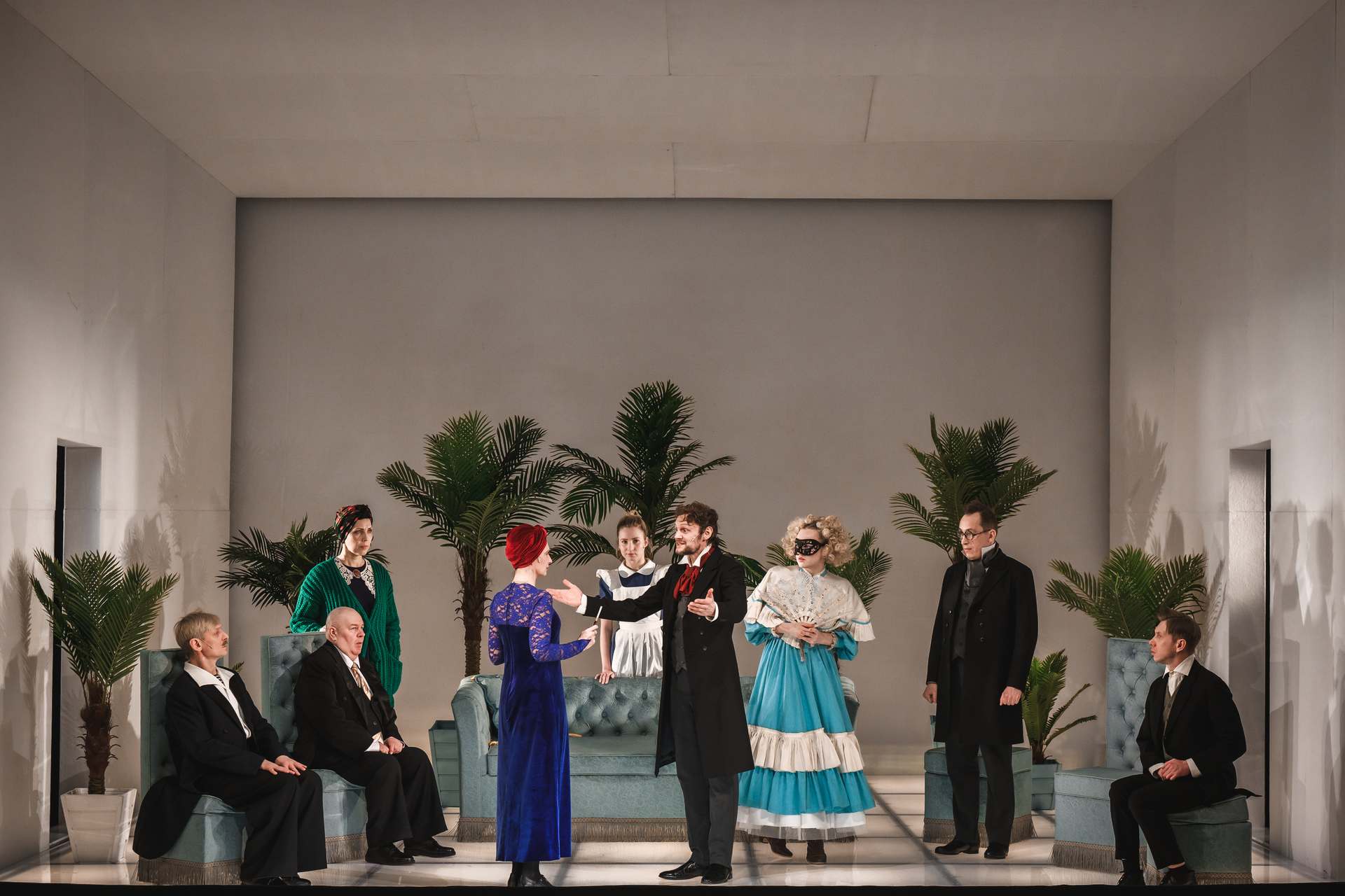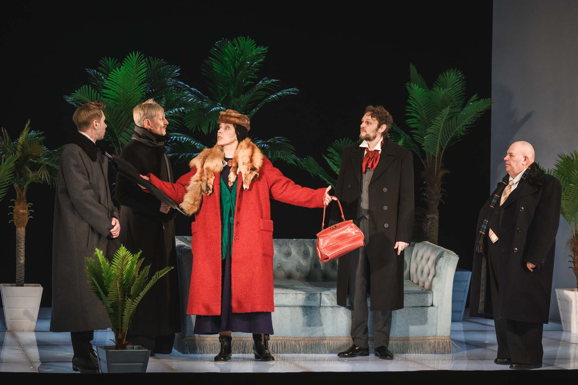 Да, у Гоголя такого нет, но придуман эпизод остроумно и даже где-то поучительно, а главное — смешно. На его фоне особенно эффектно выглядит уже упомянутый проход по авансцене, когда все женихи-аристократы семенят с разной степенью убогости, и лишь Стариков шествует важно, вальяжно и уверенно. У Гоголя насмешка по поводу желания купеческой дочки выйти непременно за аристократа очевидна, так что авторы спектакля, придумывая собственные гэги и репризы, вовсе не отошли от идей автора пьесы.