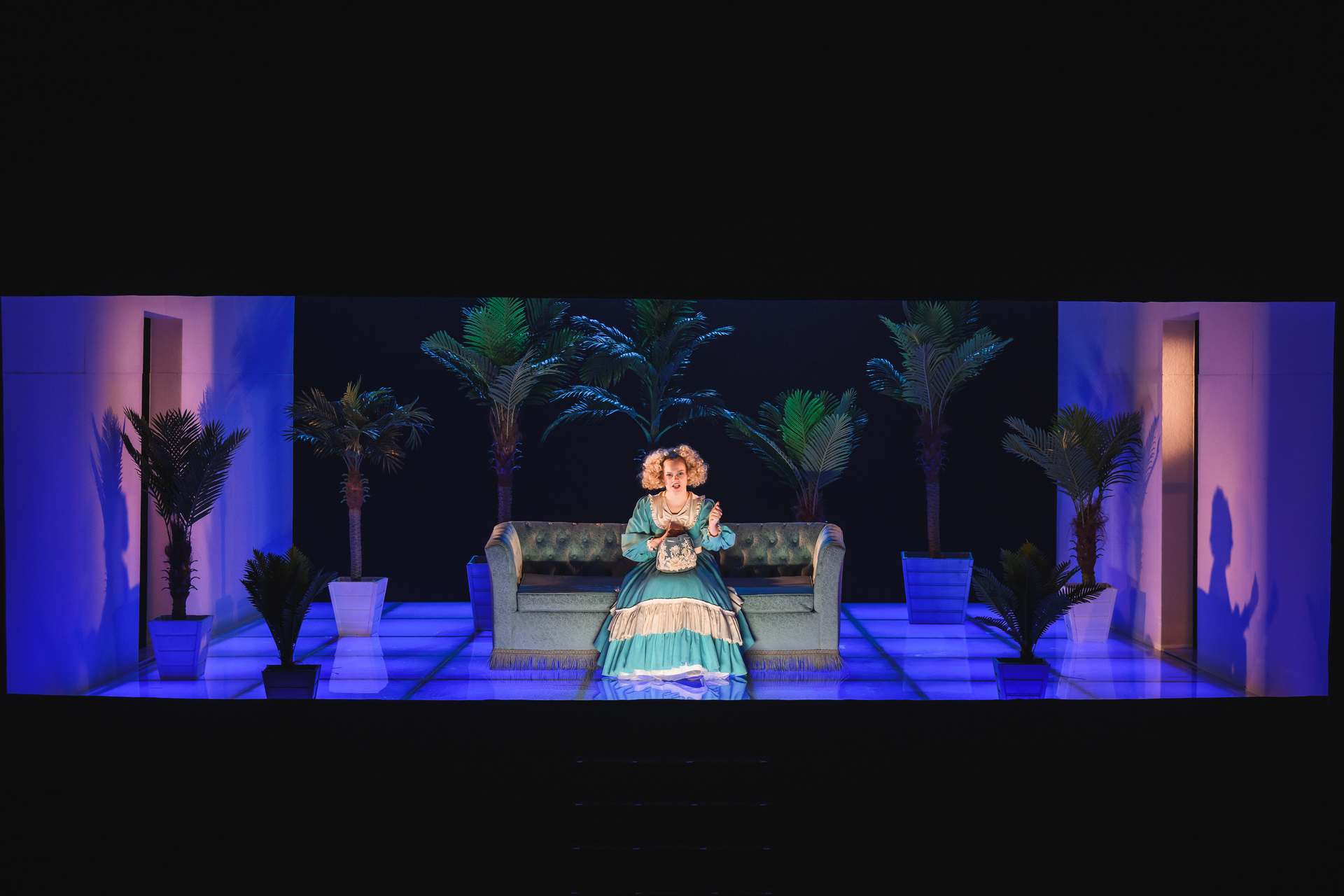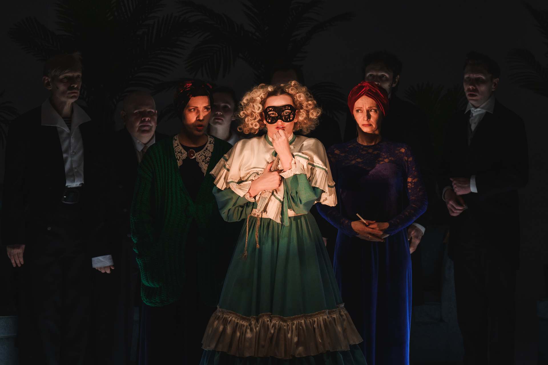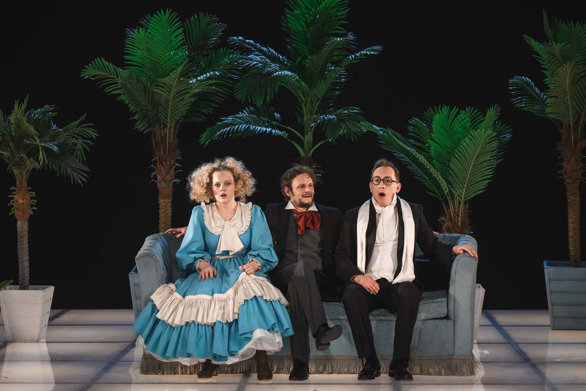 Было бы непростительно не упомянуть Анастасию Демьянец, которая в роли Агафьи Тихоновны, в пышных буклях и юбках, приобретает черты кустодиевской красотки. Мы знаем Анастасию по множеству разных ролей — она и подросток, и разбитая жизнью трагическая героиня, и панк, но и здесь она оказывается очень на месте, давая волю раскованной эксцентрике на грани с акробатикой.