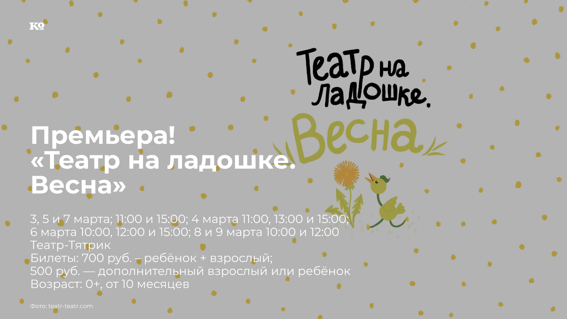 Бэби-спектакль под звуки весенней капели. Ура, природа просыпается! С первыми лучиками тёплого солнца издалека прилетели птицы. Главный герой «Весны» — маленький птенчик, который только учится ходить и летать. Он очень похож на маленьких зрителей, начинающих знакомство с этим интересным миром. Вместе они будут наблюдать за солнечными зайчиками, прыгающими по стенам, звенеть колокольчиками, слушать капель и пение первых птиц, а потом нарисуют большую яркую картину.