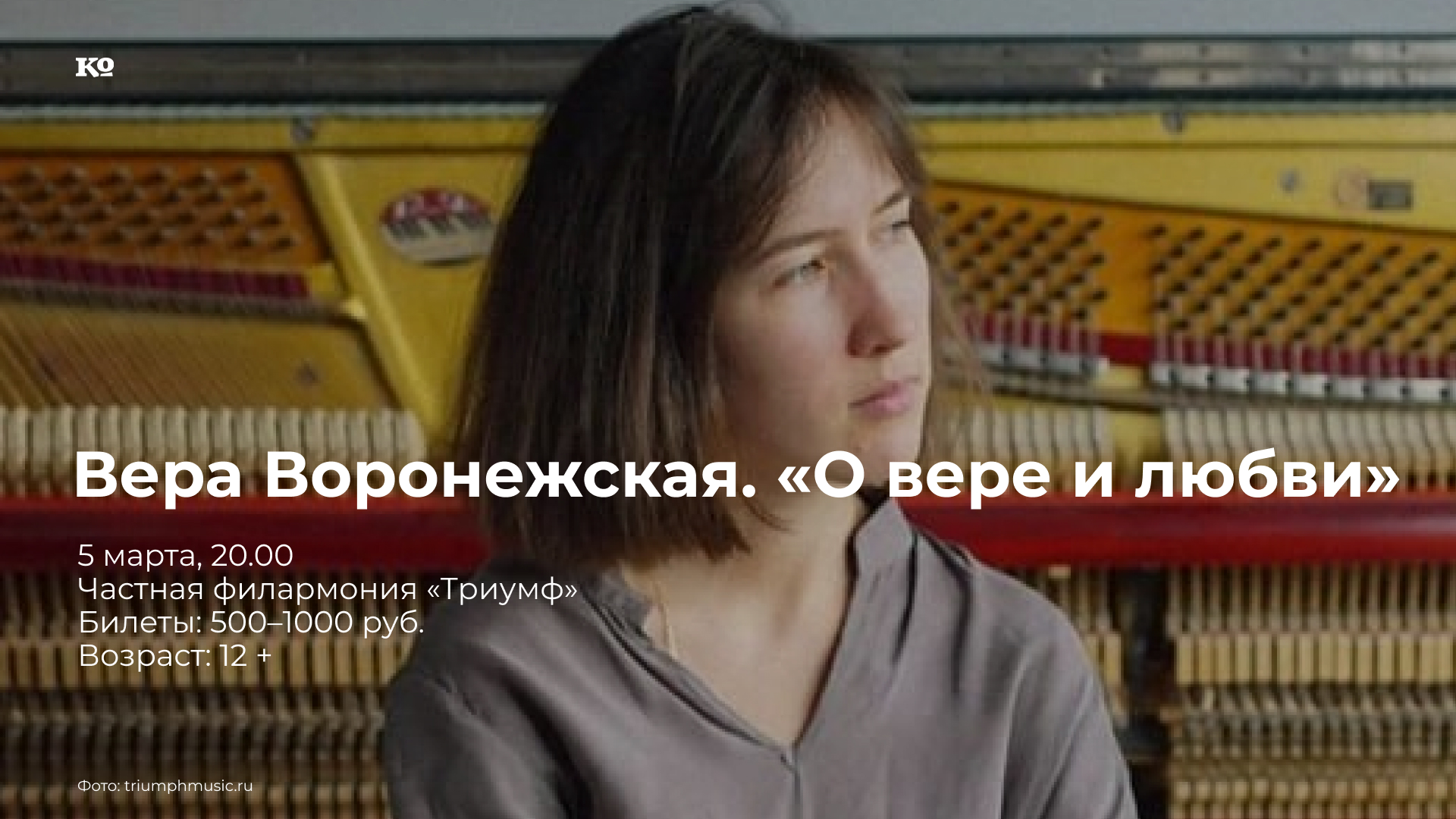 «О вере и любви» — это название пяти новых фортепианных фантазий композитора Руста Позюмского, которые он посвятил пианистке Вере Воронежской. В исполнении Веры Воронежской прозвучат фортепианные произведения Руста Позюмского, Оливье Мессиана, Александра Скрябина, Рихарда Вагнера — музыка, помогающая подняться над действительностью и поверить в то, что есть что-то вечное и неприкосновенное. Концерт пройдёт в формате piano-gala: в полной темноте, только один-единственный луч софита на рояль и на парящие над клавишами руки пианиста. По традиции зрители могут располагаться на пуфиках и подушках почти у самого рояля, а также на обычных зрительских местах.