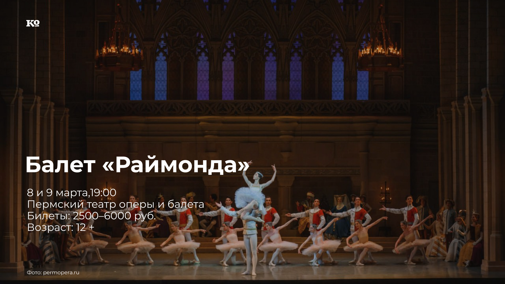 Хореография Мариуса Петипа и Константина Сергеева в редакции Елены Панковой и Антона Пимонова. В 1898 году Мариус Петипа сочиняет свой последний большой шедевр, ставший апогеем эстетики и самого хореографа, и всего классического балета XIX века, — «Раймонду», с которой на сцене Мариинского театра дебютирует 33-летний Александр Глазунов. К 125-летию со дня первого представления «Раймонды» приурочено возвращение балета Глазунова — Петипа на пермскую сцену. Над постановкой работали балетмейстеры Елена Панкова и Антон Пимонов, дирижер Петр Белякин и художницы Альона Пикалова и Татьяна Ногинова. Состав 8 марта: Раймонда — Булган Рэнцэндорж, Жан де Бриен — Кирилл Макурин; 9 марта: Раймонда — Полина Ланцева, Жан де Бриен — Сергей Угрюмов.