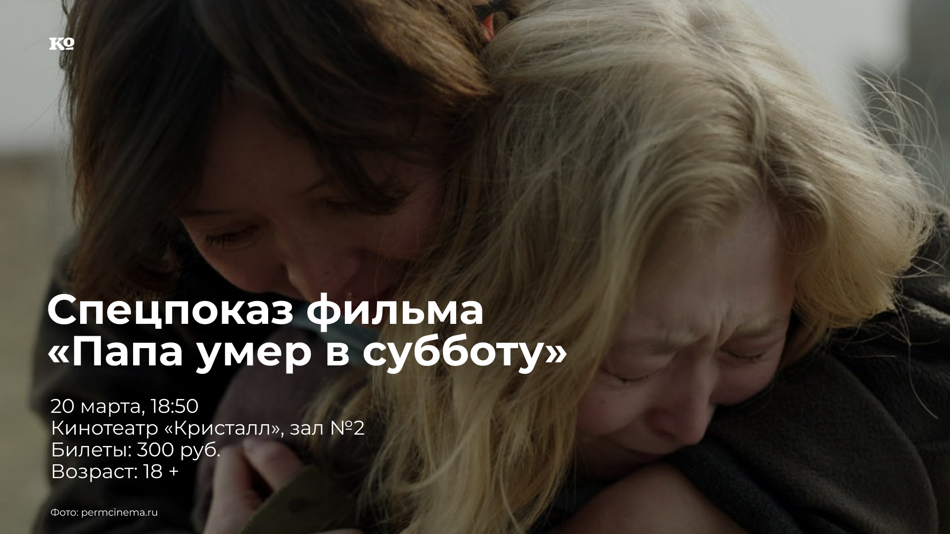Зрительская премьера ироничной драмы «Папа умер в субботу» Заки Абдрахмановой. После показа зрители смогут присоединиться к обсуждению фильма с режиссёром в формате Zoom. Фильм получил награду «Лучший дебют» на кинофестивале «Маяк» и признание кинокритиков, был отмечен жюри премии «Белый слон» в номинациях «Лучший полнометражный игровой дебют» и «Лучшая женская роль второго плана» (Самал Еслямова). «Папа умер в субботу» — это история москвички Айко, которая всю жизнь ненавидела своего деспотичного отца, но после его смерти узнаёт о нем неожиданные подробности от его второй семьи.