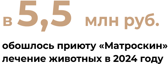 «Довольно большая сумма, если сравнить с позапрошлым годом, когда было потрачено около 2 млн руб., — поясняет Галя Море. — Всё это связано и с очень сильным удорожанием ветеринарных услуг, и с тем, что у нас возросло количество животных, которым была оказана помощь в ветеринарных клиниках, поскольку в прошлом году у нас было очень много кошек, которые пострадали от рук человека или попали под машину, выпали из окна и нуждались в серьёзном ветеринарном, хирургическом вмешательстве, поэтому суммы вот такие космические».