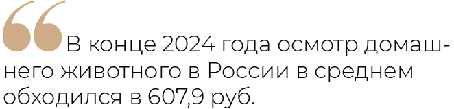 Если брать общероссийскую статистику, то, согласно данным Росстата, в конце 2024 года осмотр домашнего животного в среднем обходился в 607,9 руб., что на 16,5% дороже, чем в аналогичном периоде 2023 года, а средняя цена прививки выросла на 11,4% — до 1558,6 руб. В пермской ветклинике «Белый клык» по сравнению с концом 2024 года средний чек на услуги вырос на 10—15% и составляет от 4000 до 6000 руб., в зависимости от конкретной проблемы.
