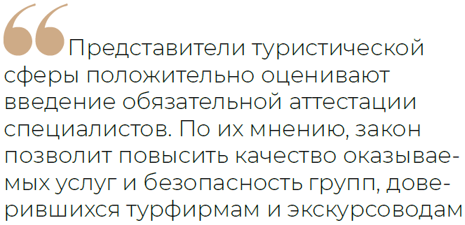 Аттестация специалистов в сфере туризма в России стала обязательной с 2022 года. С начала июля 2024 года выход на маршруты, требующие специального сопровождения, был запрещён для инструкторов-проводников, сведения о которых отсутствуют в едином федеральном реестре, а с 1 марта 2025 года ограничение коснулось и неаттестованных экскурсоводов и гидов-переводчиков.