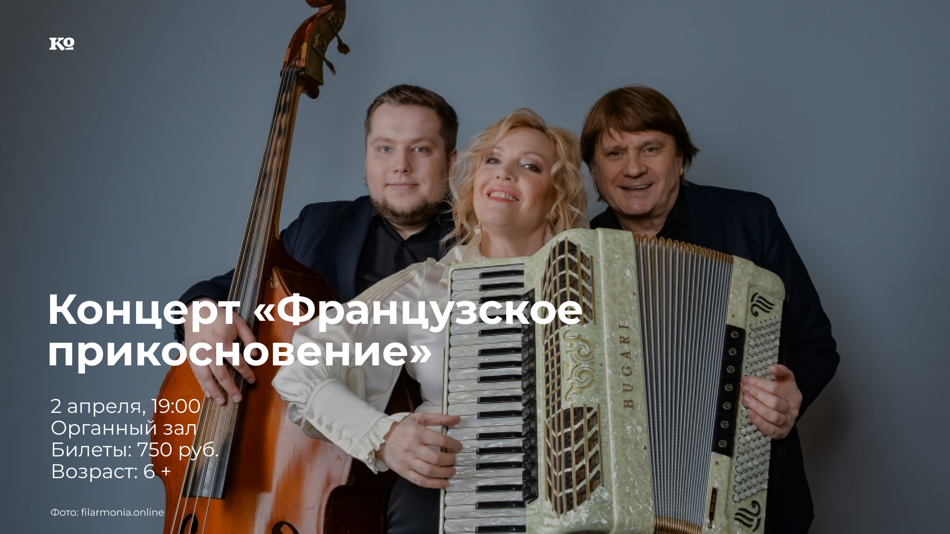 Настоящая классика французского шансона — музыка чувств, мимолётных впечатлений и изменчивых настроений прозвучит на концерте инструментального ансамбля «Маэстро Аккордеон». В составе ансамбля — заслуженная артистка России Ольга Парфентьева (аккордеон) и лауреаты джазовых фестивалей Константин Корчагин (гитара) и Никита Баталов (контрабас). Прозвучат «Под небом Парижа» Юбера Жиро, «Французское прикосновение» Ришара Гальяно, «В Париже» Франсиса Лемарка, а так же хиты для аккордеона Астора Пьяццоллы, Карлоса Гарделя, Луиса Феррари и мелодии из репертуара Эдит Пиаф, Тони Мурена, Сальвадора Адамо, Шарля Азнавура, Изабель Жеффруа.
