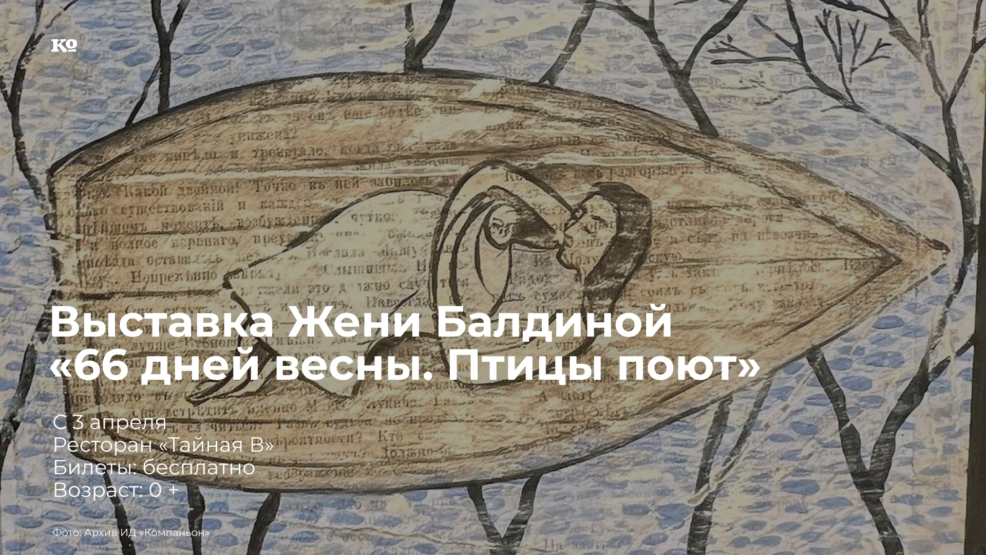 Специально для выставки в пермском ресторане художница из Березников написала 12 картин. В экспозиции будут и другие её работы, многие можно будет купить. Кроме того, в продаже будут авторские постеры Жени. В течение работы выставки запланированы три авторских вечера художницы, когда можно будет послушать её рассказы и пообщаться. Опираясь на артефакты своей семьи, своего рода, питаясь близостью к природе и земле, Женя Балдина создаёт удивительные по силе эмоций объекты, вступающие в диалог со зрителем о самом важном, глубинном, первородном: детстве, семье, любви, вере, внутреннем мире человека и мироустройства в целом. Сочетая детскую открытость и зоркость с жизненным опытом и мудростью, она видит в каждом встреченном предмете его историю — и прошлую, и будущую.