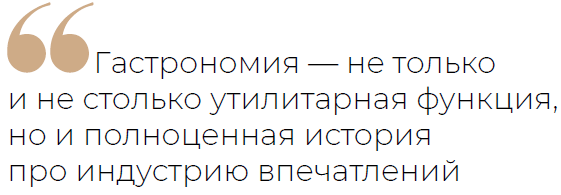 «Есть определённая категория людей, которые воспринимают гастрономию не только как утилитарную функцию, но и как индустрию впечатлений. Процент трат среднестатистического россиянина на индустрию впечатлений ежегодно растёт в разных регионах от 2 до 8%. То есть люди всё больше готовы тратить деньги не только на поддержание своих основных функций, но и на то, чтобы сделать свою жизнь чуточку более прекрасной», — заключил Олег Ощепков.