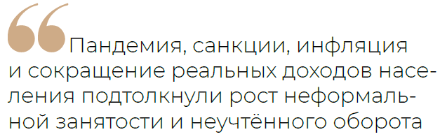 По словам Юлии Стародумовой, пандемия, санкции, инфляция и сокращение реальных доходов населения подтолкнули рост неформальной занятости и неучтённого оборота. Эльвира Кариева дополняет, что пандемия 2020 года активизировала теневую торговлю, а санкции 2022 года, отключившие Apple Pay, Google Pay и карты Visa/MasterCard, перевели многие транзакции в наличный расчёт, сделав их невидимыми для контроля. Также эксперт отмечает рост объёма наличности в стране, связанный с курсом рубля и валютными ограничениями ЦБ РФ в начале 2022 года, что усилило теневые потоки.
