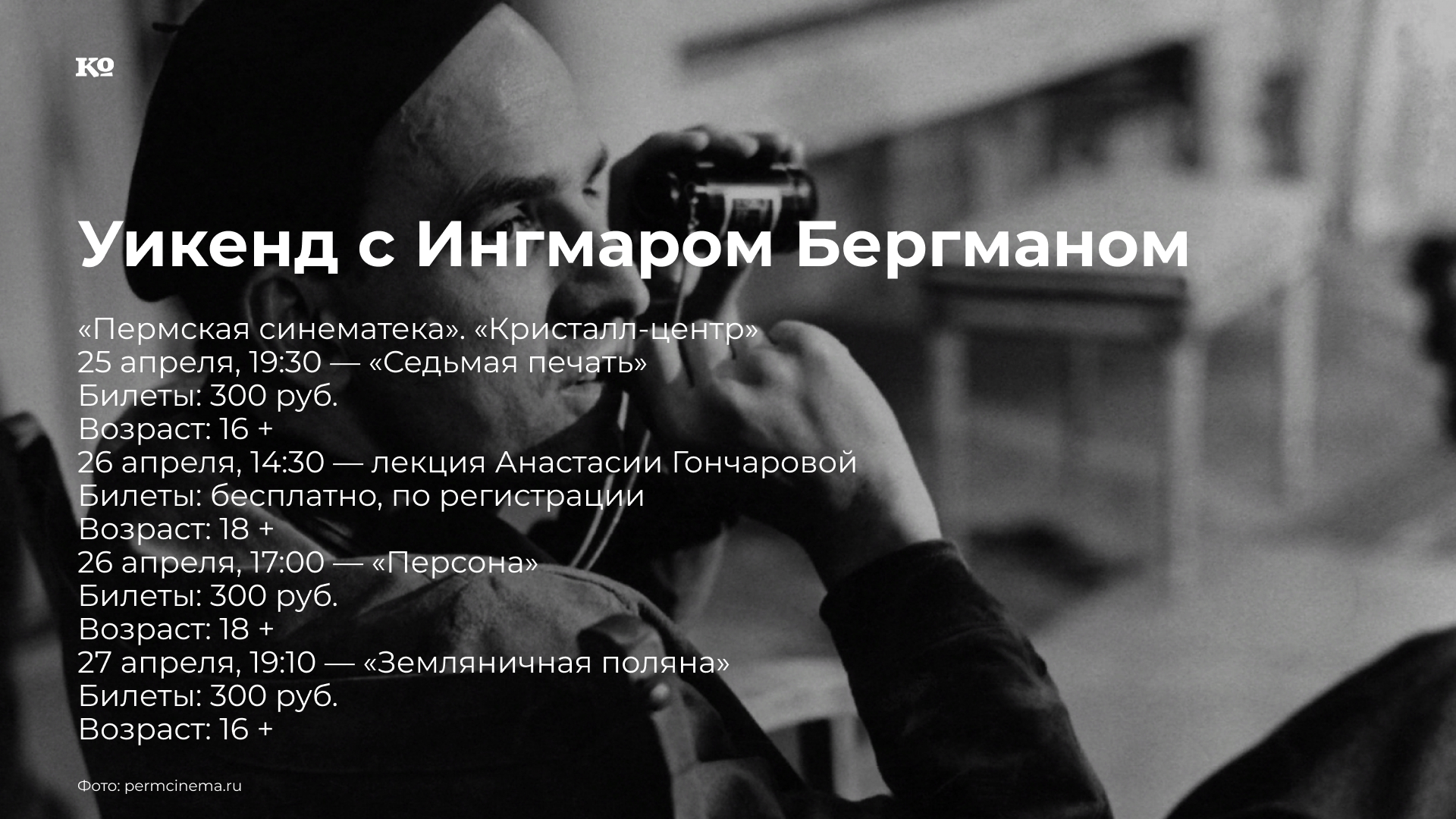 Ингмар Бергман — одна из центральных фигур в истории мирового кинематографа. Его творчество наполнено метафизическим поиском, исследованием тем одиночества, смерти, веры и страха. Шведский классик театра и кинематографа, поэт отчаяния и поклонник красивых женщин, фантазёр, сумасброд, отшельник — слова «Ингмар Бергман» вмещают в себя множество разных смыслов. Даже спустя десятилетия его фильмы не утратили силы своих образов и универсальности высказывания. В рамках «Уикенда с Ингмаром Бергманом» будут показаны три великих фильма. «Седьмая печать» — картина о поиске человеком смысла собственного существования, которой Бергман заявил о себе как о большом авторе. «Персона» — камерная история о гранях человеческой личности, внешнем и внутреннем, истинном и фальшивом. «Земляничная поляна» — во многом автобиографическая картина, наполненная личными переживаниями и воспоминаниями режиссёра. На лекции кинокритика, исследователем кинематографа северных стран Анастасии Гончаровой «Ингмар Бергман: конфликт, катарсис и смехотерапия» речь пойдёт о сквозных мотивах творчества режиссёра, о тесной связи кино с его личной жизнью, о жанровом разнообразии и рабочем постоянстве.