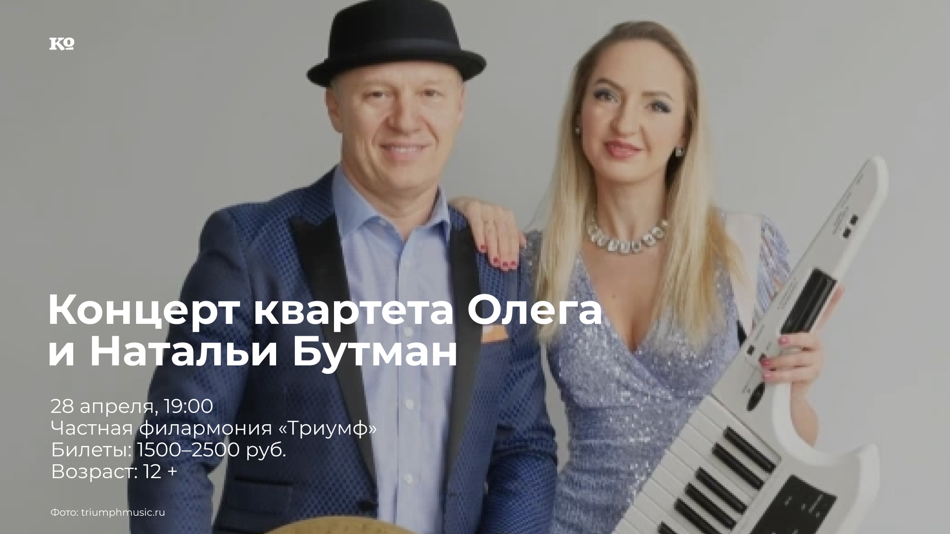 Олег и Наталья Бутман — звезды российского джаза, признанный брэнд на мировой джазовой сцене, члены Московского отделения Союза композиторов России, обладатели специальной премии журнала Billboard, послы российского джаза за рубежом. На их счету восемь сольных альбомов, четыре из которых — с авторской музыкой. Имя Олега Бутмана включено в американскую «Энциклопедию джаза», Олег и Наталья включены в российскую «Энциклопедию джаза» Владимира Фейертага. В Перми Олег и Наталья с квартетом исполнят хиты мирового джаза.