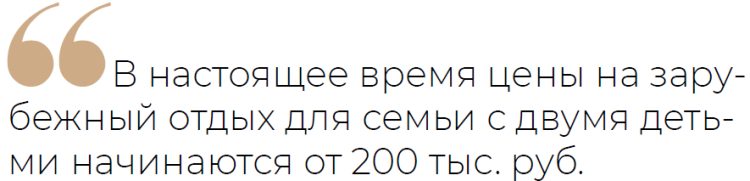 По данным «Дома солнца», в настоящее время цены на зарубежный отдых для семьи с двумя детьми начинаются от 200 тыс. руб. В «Бутике путешествий» отметили, что, несмотря на выросший интерес к зарубежным поездкам, повышения стоимости туров нет: «Цены, наоборот, очень приятные».