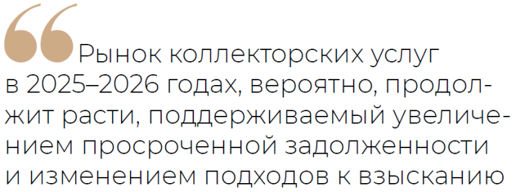 Наконец, рынок коллекторских услуг в 2025—2026 годах, вероятно, продолжит расти, поддерживаемый увеличением просроченной задолженности и изменением подходов к взысканию. Основными драйверами этого процесса станут ухудшение собираемости долгов и расширение кредитного портфеля физических лиц.