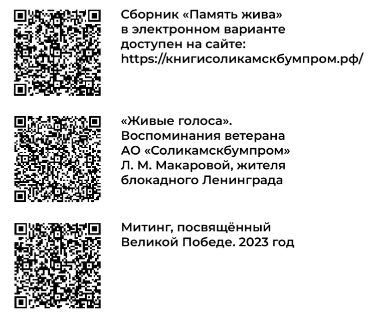 Чтобы сохранить рассказы свидетелей и участников той страшной войны, в 2011 году была инициирована акция «Живые голоса». Ветераны-бумажники делились своими военными и трудовыми воспоминаниями, рассказывали о фронтовых операциях, вспоминали погибших товарищей, вновь и вновь возвращаясь в те годы. Эти живые голоса стали бесценной частью фонда музея истории предприятия. Сегодня каждый может услышать их — аудиозаписи доступны на электронных ресурсах АО «Соликамскбумпром» под хэштегом #живые_голоса. Это уникальная возможность прикоснуться к истории, услышать её из первых уст.