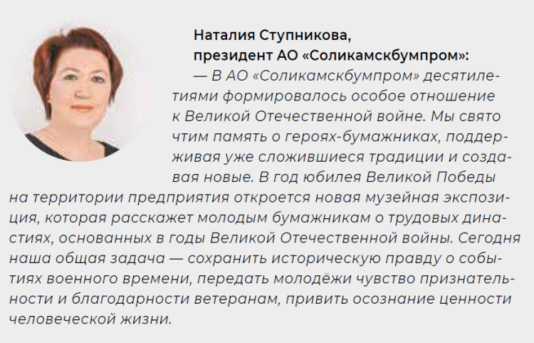 АО «Соликамскбумпром» бережно хранит память о Великой Отечественной войне — судьбоносной вехе, изменившей ход мировой истории, судьбы людей и очертания карты мира. История предприятия неразрывно связана с воспоминаниями о тех тяжёлых годах, священных для каждого из нас.
