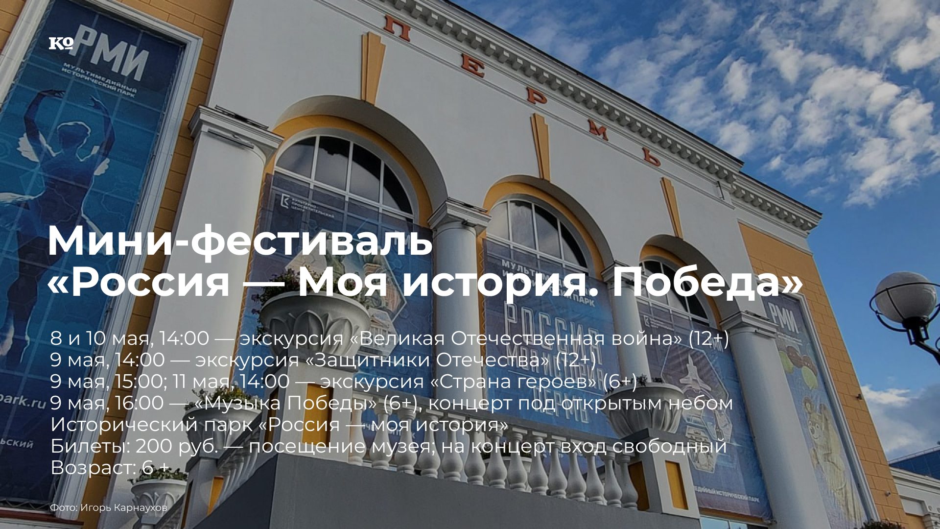 В рамках мини-фестиваля откроются новые выставки. «День Победы» — мультимедийный выставочный проект, подготовленный в сотрудничестве с Центральным музеем Великой Отечественной войны (Москва). «Лица Победы» — портреты ветеранов, представленные газетой «Комсомольская правда». «Страна героев» — мультимедийный проект, подготовленный совместно с Государственным музеем спорта (Москва) и посвящённый легендарным советским спортсменам, прошедшим войну. 9 мая посещение новых выставок, а также экспозиций «1914-1945. От великих потрясений к Великой Победе», «Три века истории Перми», «Путь к звёздам» и других — бесплатное. Кульминацией праздничного дня станет концерт под открытым небом «Музыка Победы». Исполнители — вокальный проект ROSSO. В программе — песни советского времени: «От героев былых времён», «Песенка фронтового шофёра», «Лизавета» и другая классика, а также популярные композиции современных авторов. В случае непогоды концерт будет перенесён в зал.