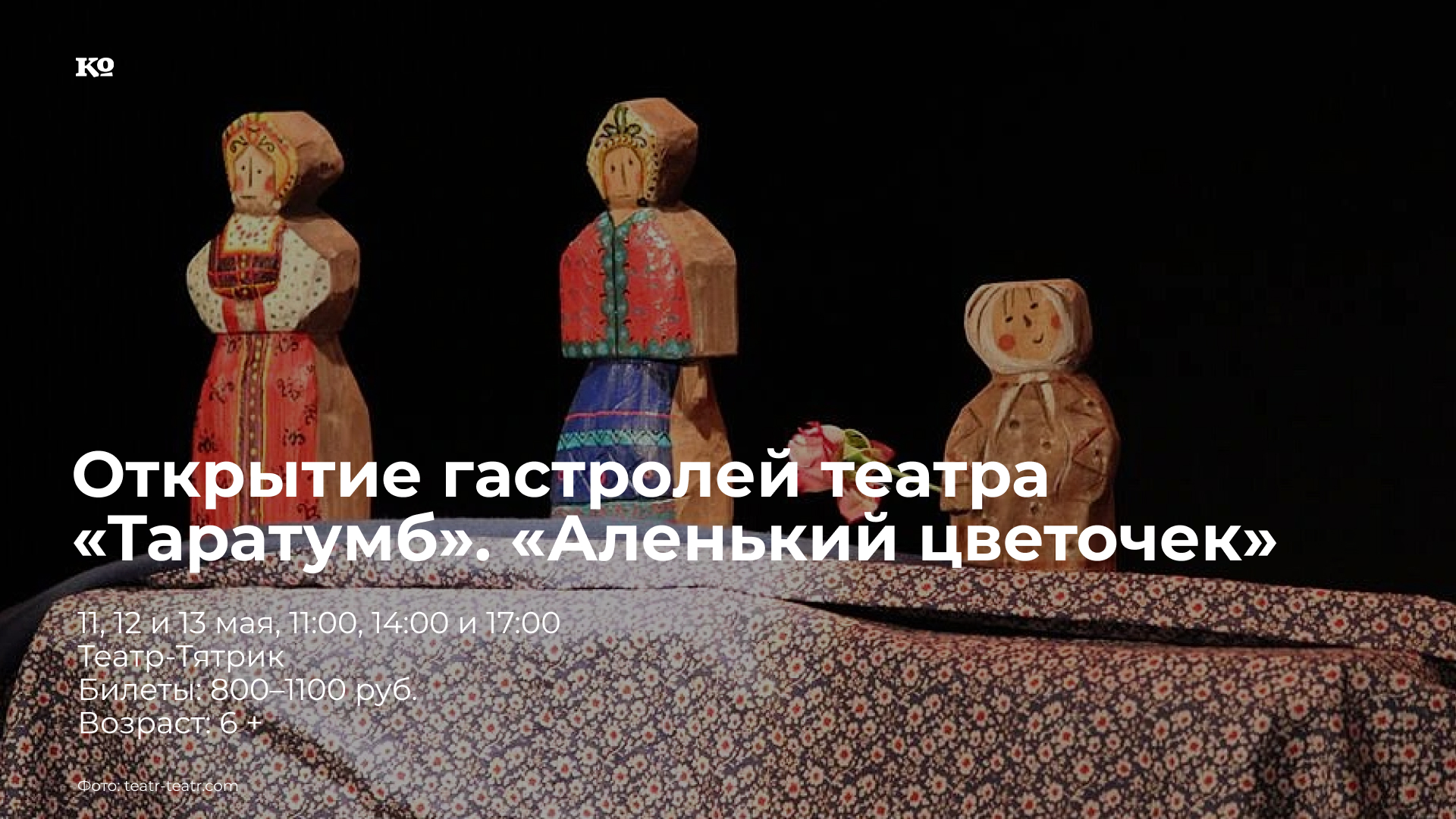 С 11 по 18 мая на сцене Театра-Тятрика пройдут гастроли творческого объединения «Таратумб» (Москва). Команда «Таратумба» привезёт в Пермь три спектакля: «Аленький цветочек» (6+), «Морж, учитель и поэт» (6+) и «На краю Африки» (6+). На открытии фестиваля будет показан «Аленький цветочек» — кукольный музыкальный спектакль по мотивам сказки Сергея Аксакова. Любимая история о красавице и чудовище в особом стиле: оригинальные куклы и декорации созданы под впечатлением от традиционной деревянной игрушки русского Севера. Актёры вместе с куклами расскажут зрителям удивительную историю Настеньки, заколдованного юноши и волшебного цветка. А интерактивные сцены перенесут детей на традиционный русский двор, на ярмарку и в волшебный лес. Постановщики: режиссёры — Антон Калипанов и Ольга Шайдуллина, художник — Мария Кривцова.