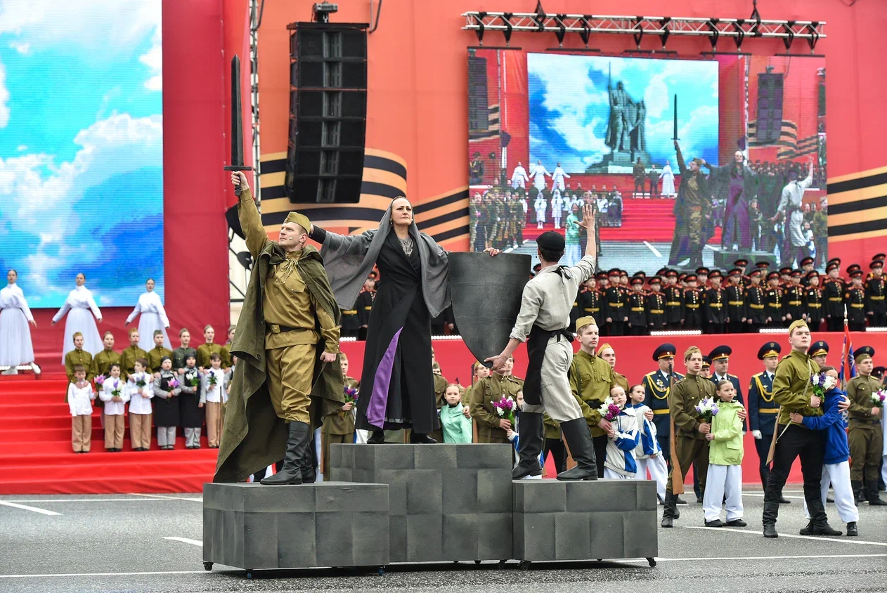 Торжества традиционно стартовали на Октябрьской площади, где зрители стали свидетелями масштабного театрализованного представления. Около тысячи артистов воссоздали историю города в годы войны.
