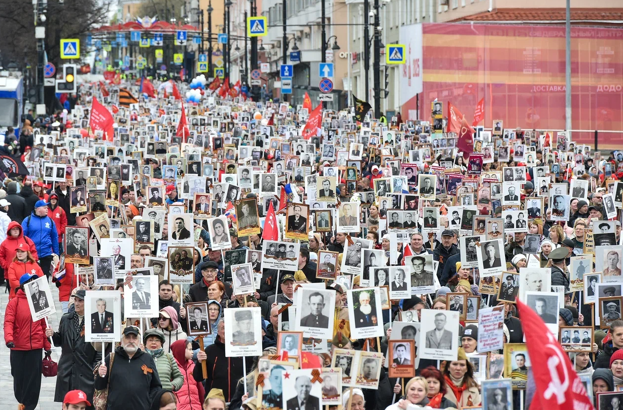 Потом на площадь вышла колонна «Бессмертного полка». Шествие, в котором приняли участие более 50 тыс. горожан, завершилось у Театра-Театра. Там был организован концерт, выставка военной техники и интерактивные площадки для всех возрастов.