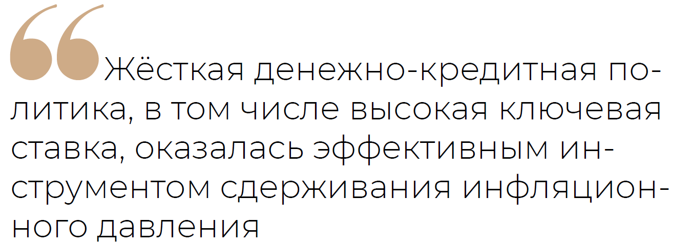 Прогноз по динамике ключевой ставки на 2025 год уже был уточнён, что отражает осторожный оптимизм регулятора: ситуация в экономике развивается несколько лучше, чем ожидалось. И хотя жёсткая политика может потребоваться в течение ещё некоторого времени, но в целом сценарий повышения ставки стал менее вероятным.