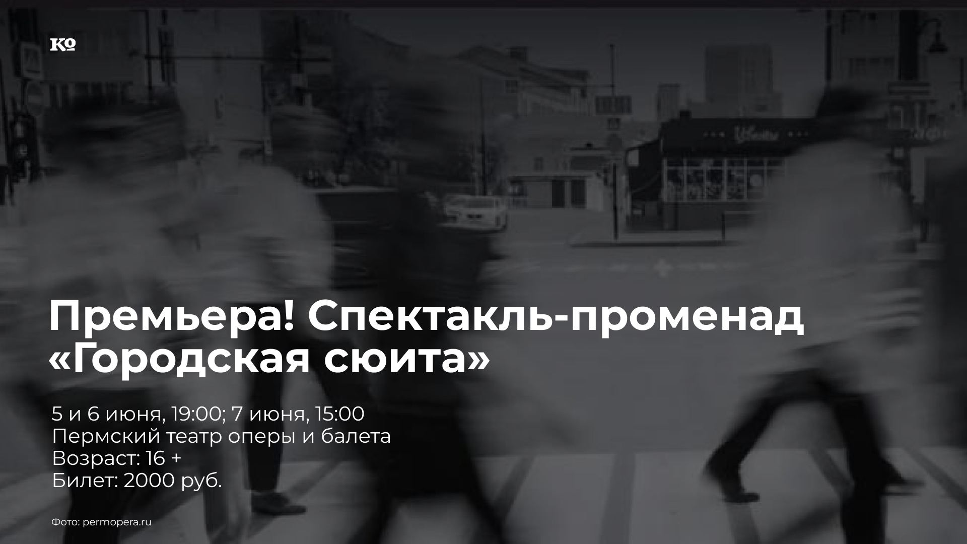 Музыкальный спектакль-прогулка, созданный Пермской оперой и творческим объединением Audiodoc. Проект исследует звучание города, его темп, ритм и то, как люди воспринимают городское пространство. Это спектакль о внимании — к себе и к миру вокруг, о том, какие эмоции рождает жизнь в современном городе. Режиссёр Дмитрий Мульков, композитор Андрей Платонов и драматург Лиза Булаева создают аудиоспектакли, основанные на документальных записях. Музыкальная прогулка будет начинаться в фойе Театра оперы и балета и пройдёт как через самые шумные городские перекрёстки, так и через самые тихие, уединённые городские локации.