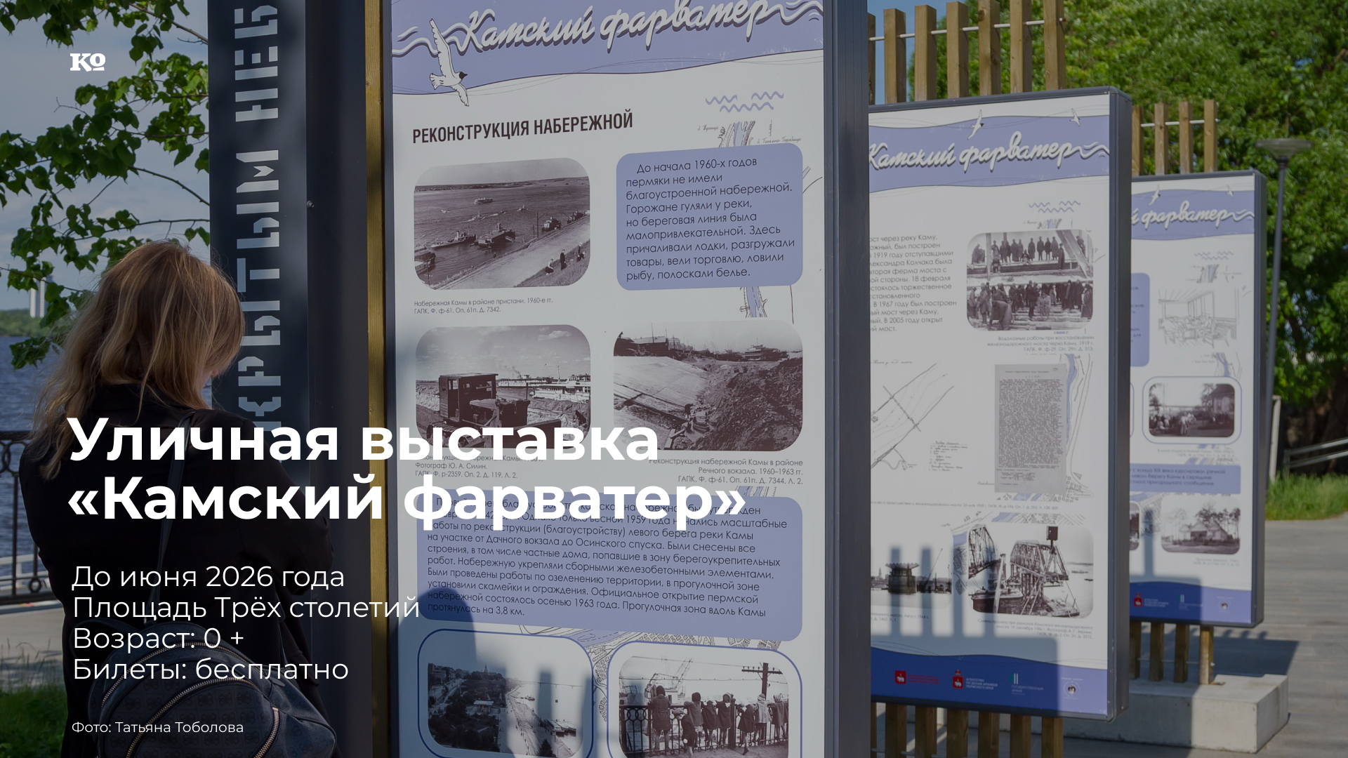 Центральный выставочный зал и Государственный архив Пермского края открыли стендовую уличную выставку, основанную на архивных материалах, иллюстрирующих тесные связи пермяков с Камой. Показаны места, связанные с судоходством: затоны, пристани, причалы, мосты, предприятия, осуществлявшие строительство и ремонт судов. Представлены люди — ключевые фигуры в истории судостроения и судоходства на Каме. Рассказано о видах речного транспорта конца XIX-XX веков; особое место уделяется истории появления в Перми в 1960 году скоростных речных судов на подводных крыльях. Особая тема — эвакуация в годы Великой Отечественной войны жителей Ленинграда и сокровищ из ленинградских музеев: они прибывали на Речной вокзал Перми. Среди использованных материалов можно увидеть работы знаменитых пермских фотографов Ивана Кисарева, Анатолия Зернина, Юрия Силина и рисунок художника Анатолия Тумбасова.