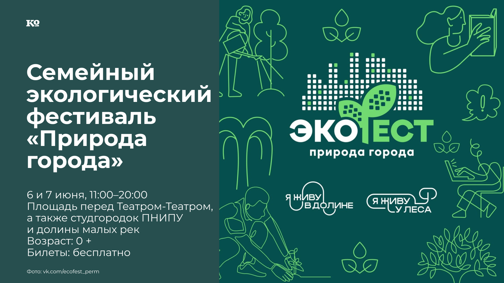 В программе экофеста — лектории на актуальные природоохранные темы, в том числе лекции об уссурийском полиграфе и об изменениях климата; мастер-классы по уходу за комнатными растениями, по изготовлению сувениров из природных материалов и другие; конкурс арт-объектов; волонтёрские экологические акции, экскурсии по долинам малых рек и другим природным локациям Перми; экологические квесты и викторины. Весь день на площади — музыкальная программа: 6 июня — электронная музыка, 7 июня — фольклорные проекты (среди прочих — выступление Даши Калиной). В фестивальном городке установлены инсталляция «Лес в городе» — около 60 деревьев, которые позже будут высажены в парках Перми, и «трухлявый заповедник» — бордюр из сухих веток и брёвен, которые служат пищей и домом для насекомых.