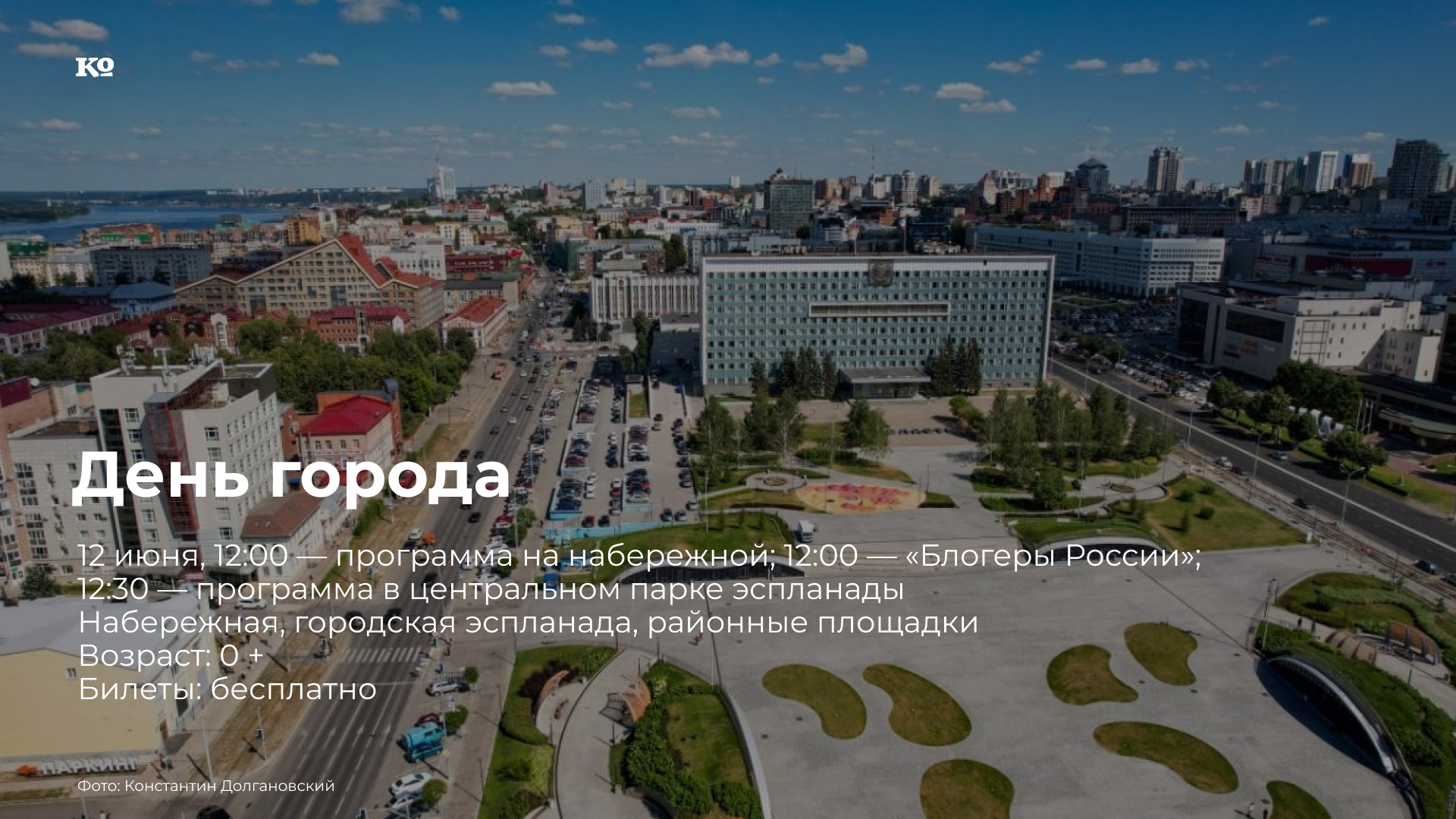 С 12:30 до 22:00 в центральном квартале эспланады пройдёт праздничная программа с участием детских и подростковых коллективов, солистов Пермской филармония и участников Российского союза боевых искусств.