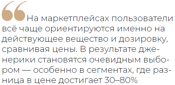 Кроме того, растёт осведомлённость пациентов о возможности подбора препаратов по МНН, что особенно заметно в онлайн-продажах. На маркетплейсах вроде «Здравсити» пользователи всё чаще ориентируются именно на действующее вещество и дозировку, сравнивая цены. В результате дженерики становятся очевидным выбором — особенно в сегментах, где разница в цене достигает 30—80%.