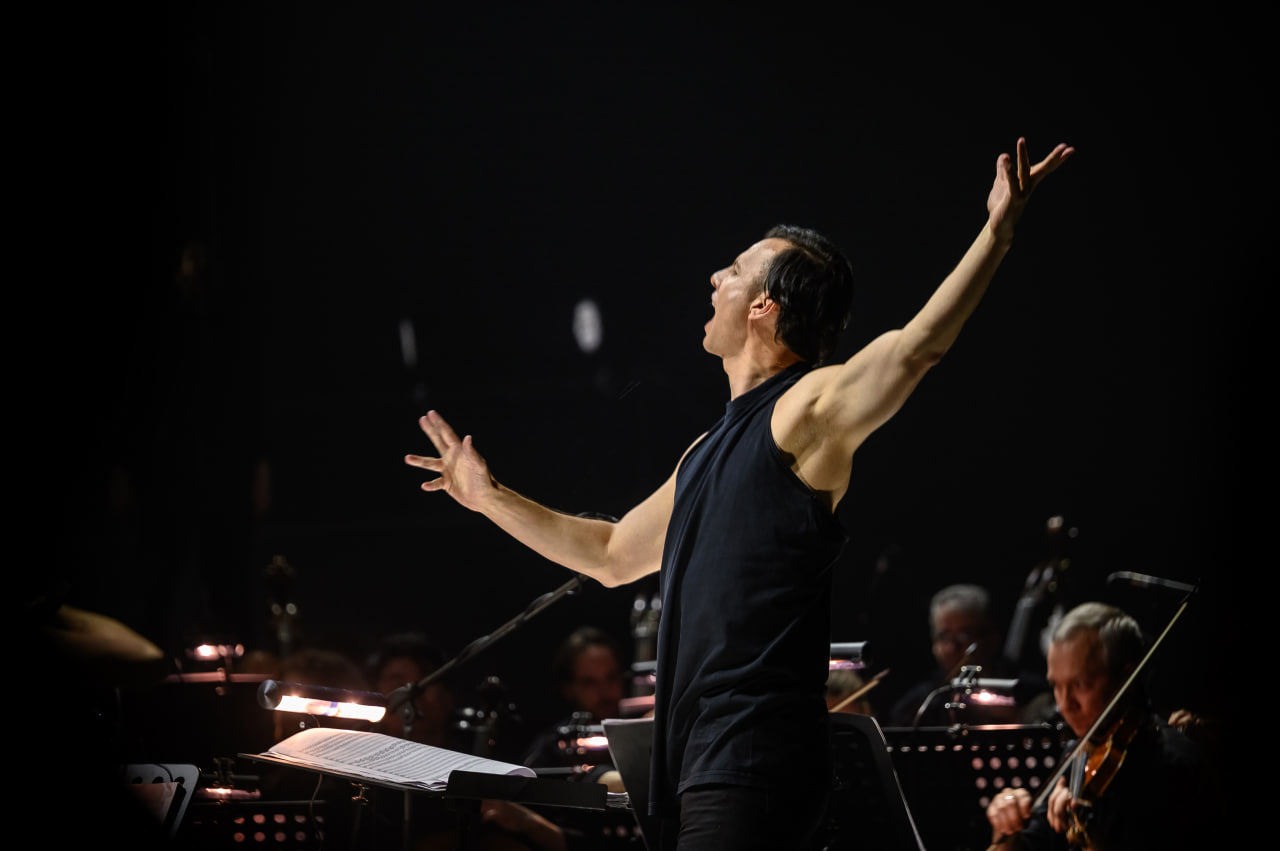 Церемония — формат строгий, канонический, однако событие под названием Hændel (12+) состояло из сплошных нарушений канона, начиная с внешнего вида дирижёра, который вышел не то что не во фраке, а даже не в рубашке: на Курентзисе была майка-борцовка с настолько открытыми плечами, что, казалось руки дирижёра растут прямо из позвоночника, как крылья. Думается, это не просто эпатаж: руки-крылья стали важной частью визуала этой церемонии, а дирижёр в ней, разумеется, солировал.