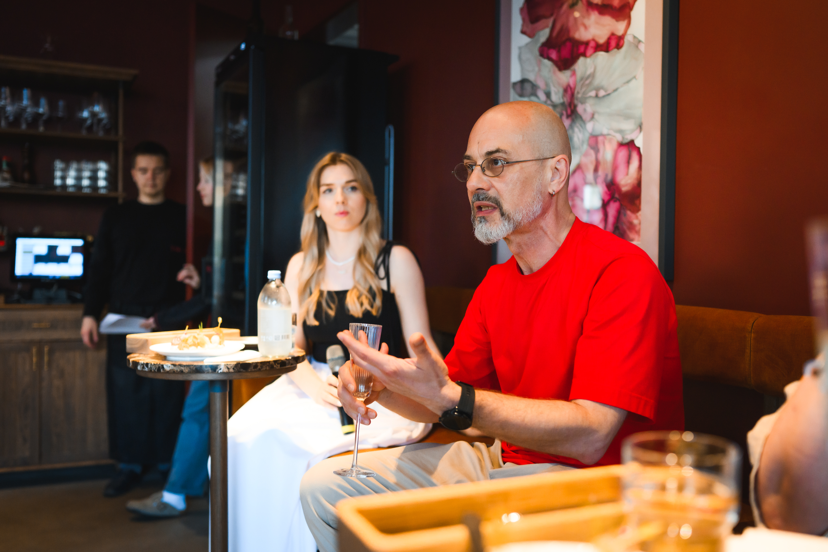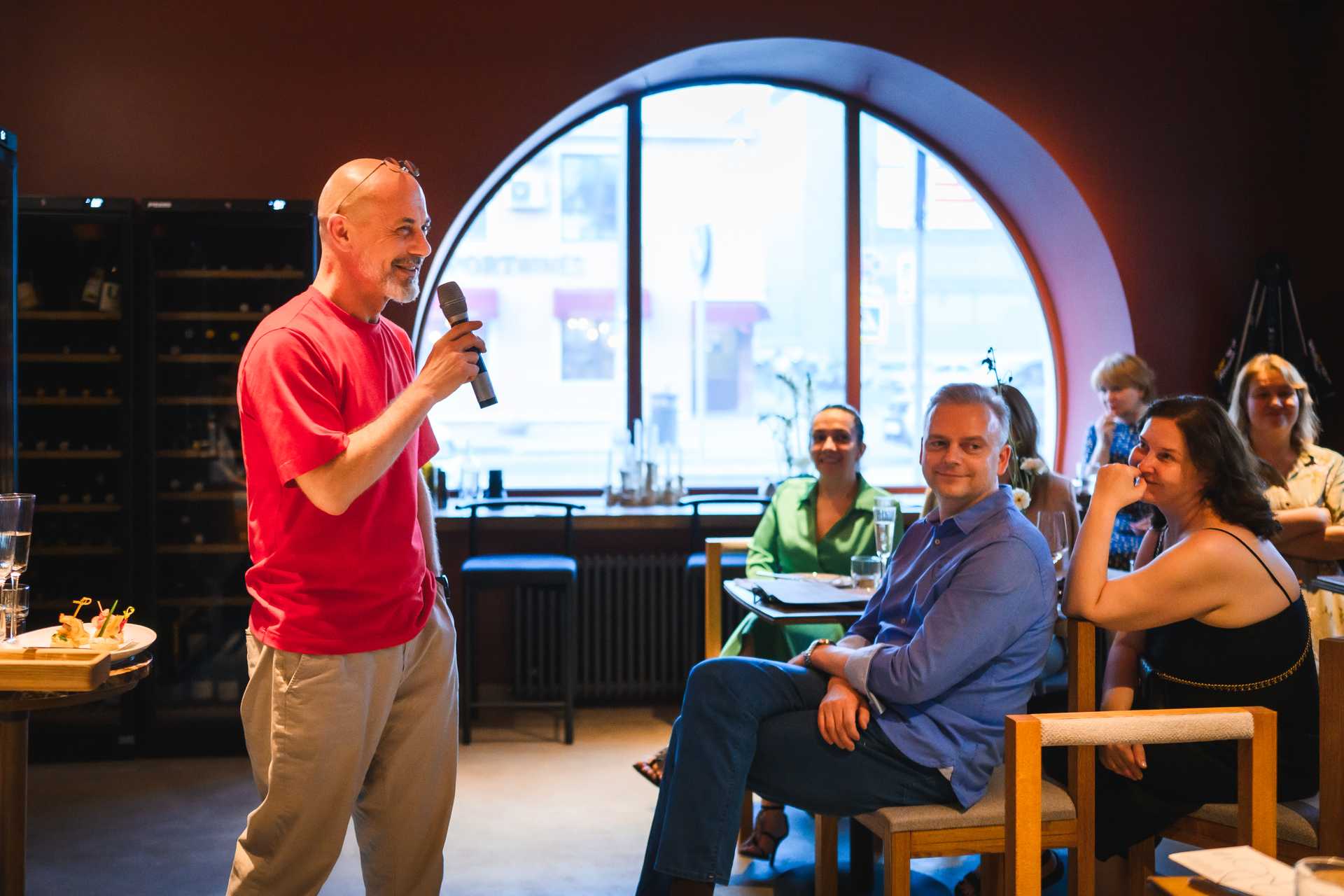 Беседа прошла живо: вопросы задавали не только журналисты «Компаньона», но и пришедшие на встречу меломаны. Вечер затянулся, вышел за рамки регламента и за пределы ресторана — стояла жара, и разговор продолжился на уличной террасе в максимально неформальном режиме. Говорили о многом. О том, что такое современный хор, о том, как Виталий Полонский пришёл в свою профессию; вспомнили историю musicAeterna, которая отмечает в этом сезоне 20-летие, и попытались разобраться, чем живёт коллектив Теодора Курентзиса сегодня, после отъезда из Перми. Даже об особенностях нотных записей барочной музыки и об использовании искусственного интеллекта для программирования концертов говорили!