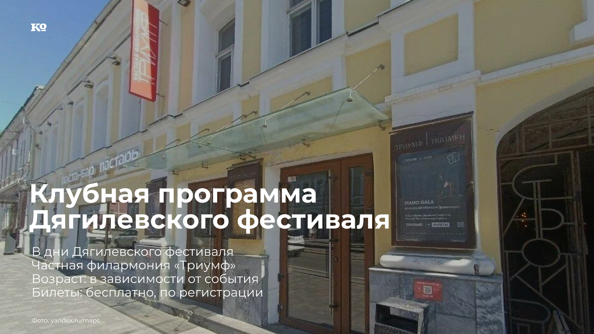Каждый клубный день начинается в 12:00 с «Распева» (12+). Артисты хора musicAeterna приглашают всех желающих петь хором. Днём — в 14:00 или 15:00 — в фестивальном клубе запланированы творческие встречи с участниками фестиваля. Пройдут встречи с хормейстером Евгением Воробьёвым, иракским музыкантом Насиром Шамма и другими творческими людьми. В любое время можно посмотреть «Кто/Что» (0+) – театральную инсталляцию Дмитрия Волкострелова, в которой зритель вступает в диалог с невидимым собеседником. Задача зрителя — догадаться, кто перед ним: человек или искусственный интеллект. В вечерней программе клуба (20 июня, 23:00) – поэтический перформанс Александры Листопадовой «Орфей: Между молчанием и речью» (16+), в основу которого легли стихотворения и проза Марины Цветаевой, а также музыка Малера, Вагнера, Шнитке, Рубинштейна и Шостаковича в живом исполнении. Пианист и композитор Артём Макоян представит 21 июня в 18:00 «Семь импровизационных взглядов» (12+) — часовую фортепианную импровизацию, сплетение впечатлений, услышанных мотивов, прожитых фестивальных дней и незапланированных модуляций, которая отразит дух Дягилевского фестиваля.