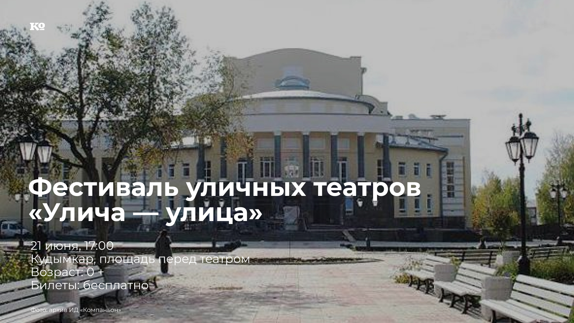 Фестиваль уличных театров пройдёт в рамках празднования 100-летия Коми-Пермяцкого округа. Будут работать одновременно несколько площадок. Участие примут коллективы из Кудымкара, сёл и посёлков Коми-Пермяцкого округа, детские и взрослые, музыкальные и театральные; а также театр «Тёплые уши» (Пермь), Baby theatre (Ижевск), «Зеркальные люди Show me» (Пермь), театральная студия «Пилигрим» (Пермь), театр кукол «Туки-Луки» (Пермь), театр огня «Игры пламени» (Пермь). Завершит фестиваль концерт фолк-группы «Шай-Май» (Кудымкар).