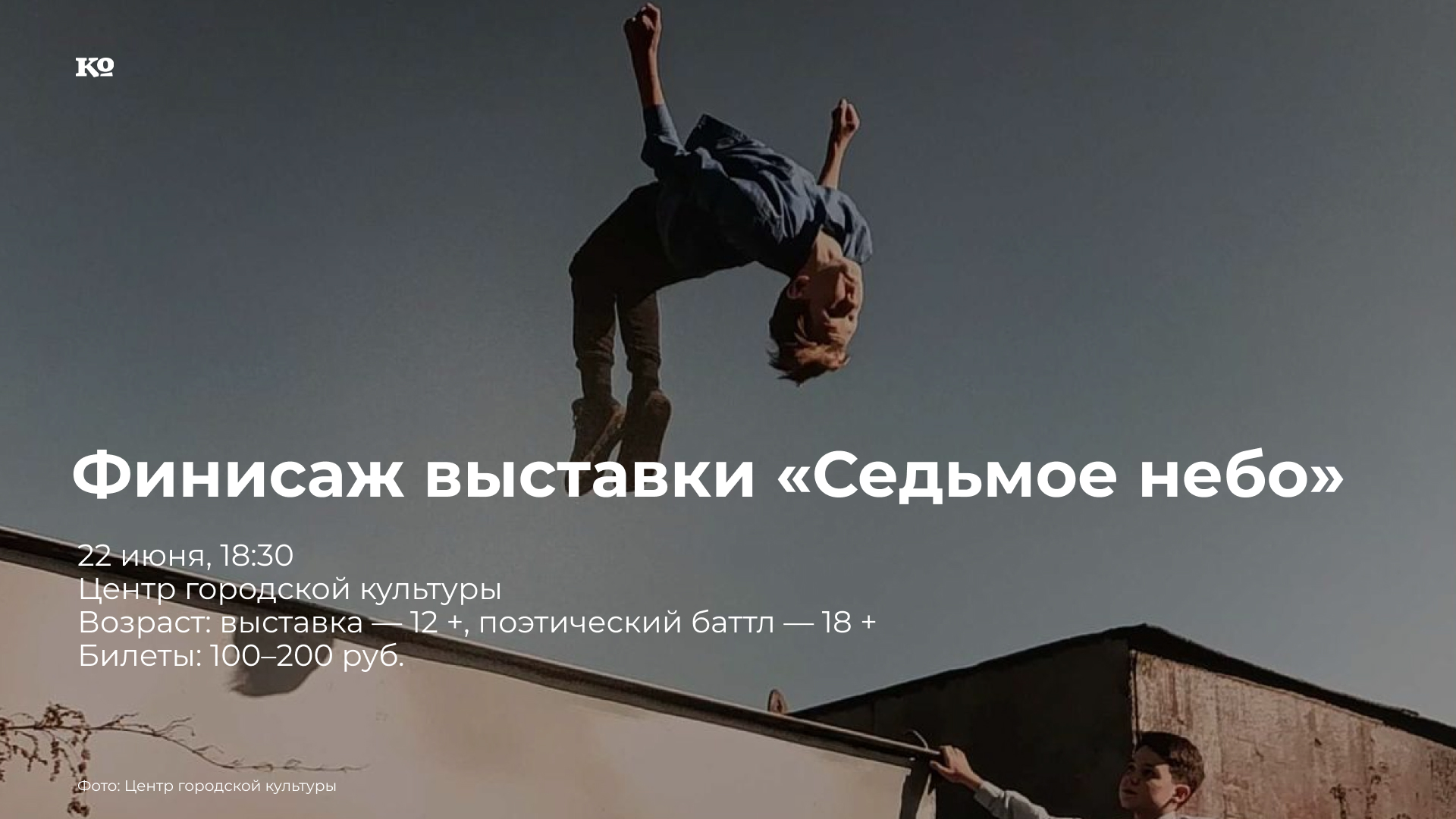 Последний день работы выставки легендарного фотографа Дмитрия Маркова «Седьмое небо». Дмитрий Марков — фотохудожник, в творчестве которого примитивное становится изысканным, бесхитростное — многозначительным. Дмитрий Марков и его снимки — это не просто портрет России, это и есть Россия. Среди представленных на выставке снимков есть много очень известных, буквально культовых, в том числе тот, что дал выставке название — «Седьмое небо» (0+): знаменитое фото с мальчиком, делающим сальто. На втором этаже ЦГК открыта выставка «Кама — она, моя», которая работает до 26 июня включительно. В рамках финисажа пройдёт поэтический баттл от команды фестиваля «Компрос».